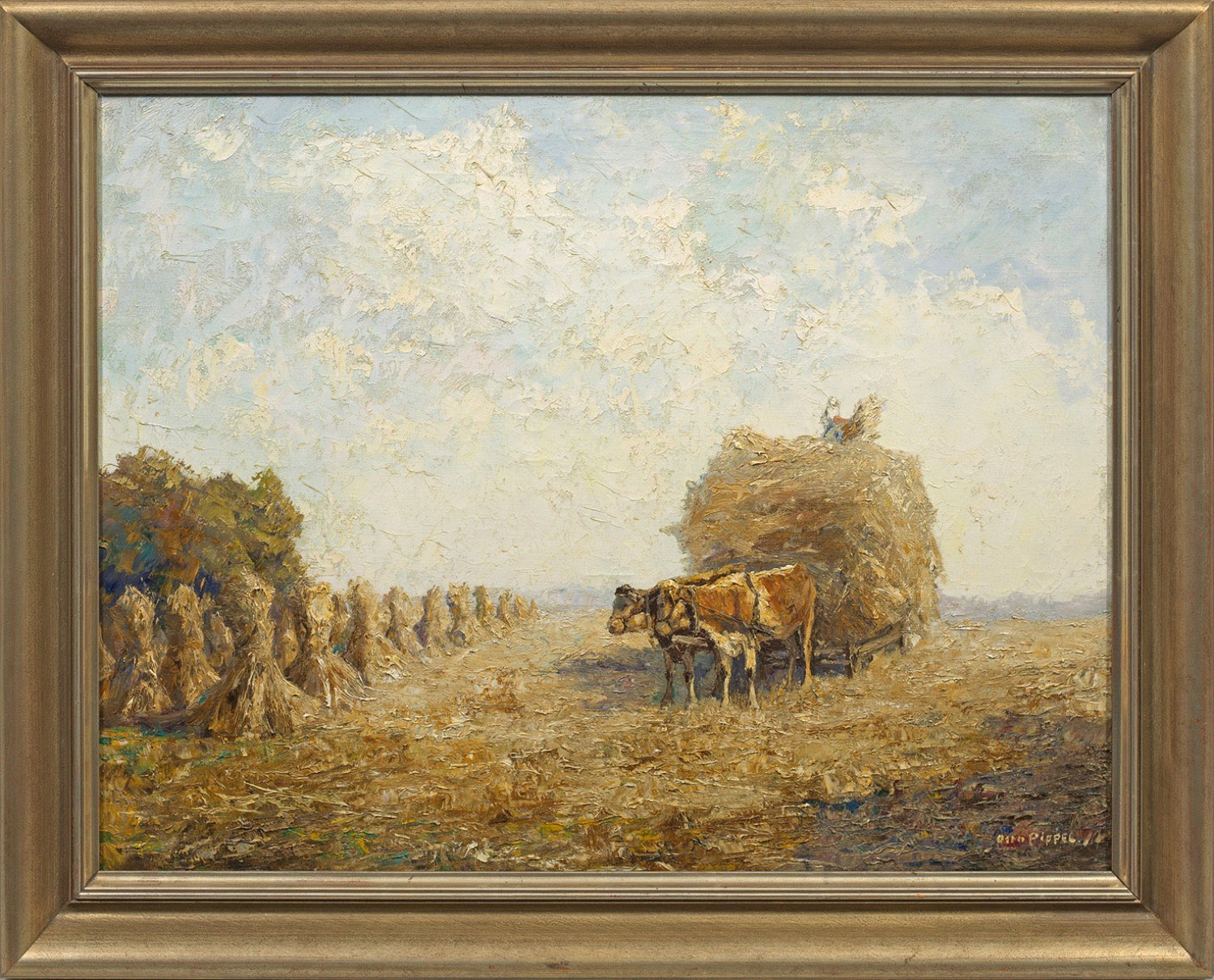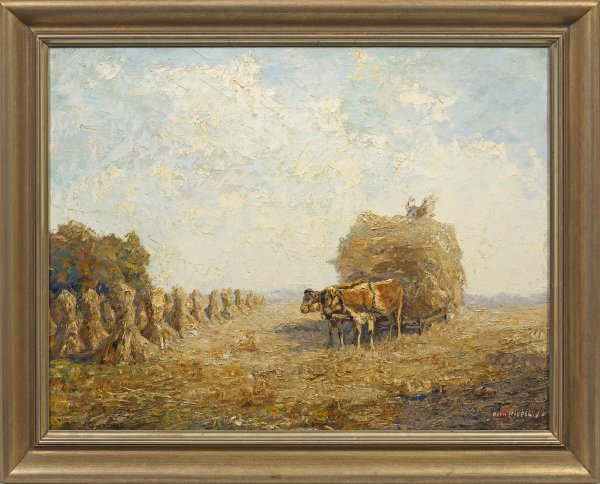 Ernteszene mit Ochsengespann und Getreidehocken, bei der Pippel virtuos das flirrende Licht eines heißen Sommertages einfing. Impressionistisches, stiltypisches Werk Pippels, der in Karlsruhe und Dresden bei Gotthardt Kuehl studierte. In Planegg bzw. Garmisch-Partenkirchen ansässig, stellte er ab 1912 im Münchener Glaspalast aus. Charakteristisch sind flimmernd wirkende Lichteffekte und ein dicht gesetzter, pastoser Farbauftrag in Spachteltechnik bzw. lockerem Pinselduktus. Öl/Lwd.; R. u. sign.; Verso auf einem Atelier-Etikett (mit Ortsangabe Planegg) vom Künstler betitelt. 65 cm x 85 cm. Rahmen.