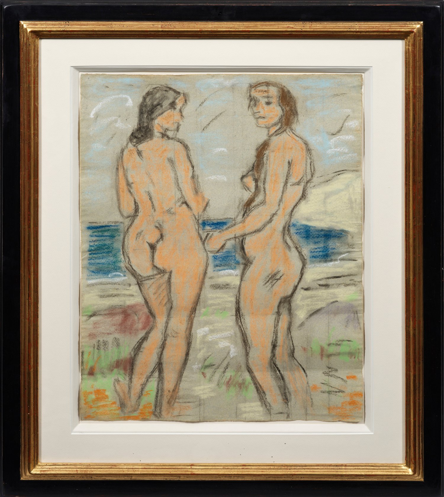 Kräftig konturierte, expressionistisch angelegte Aktzeichnung Kothers, der zu den bedeutenden wiederentdeckten Künstlern der sog. "verschollenen Generation" zählt und künstlerisch stark durch die "Brücke"-Maler Max Pechstein, Erich Heckel, Ernst Ludwig Kirchner sowie seinem Freund und Schwager Otto Müller beeinflusst wurde, wofür das vorliegende Blatt ein äußerst treffliches Beispiel darstellt. 1914 ging Kother nach Berlin, wo sich rasch erste bedeutende Erfolge einstellten. Im "Dritten Reich" gehörte auch er als Expressionist zu den verfemten "entarteten" Künstlern. Farbkreide/graues Papier. 60,5 cm x 45 cm. Rahmen.