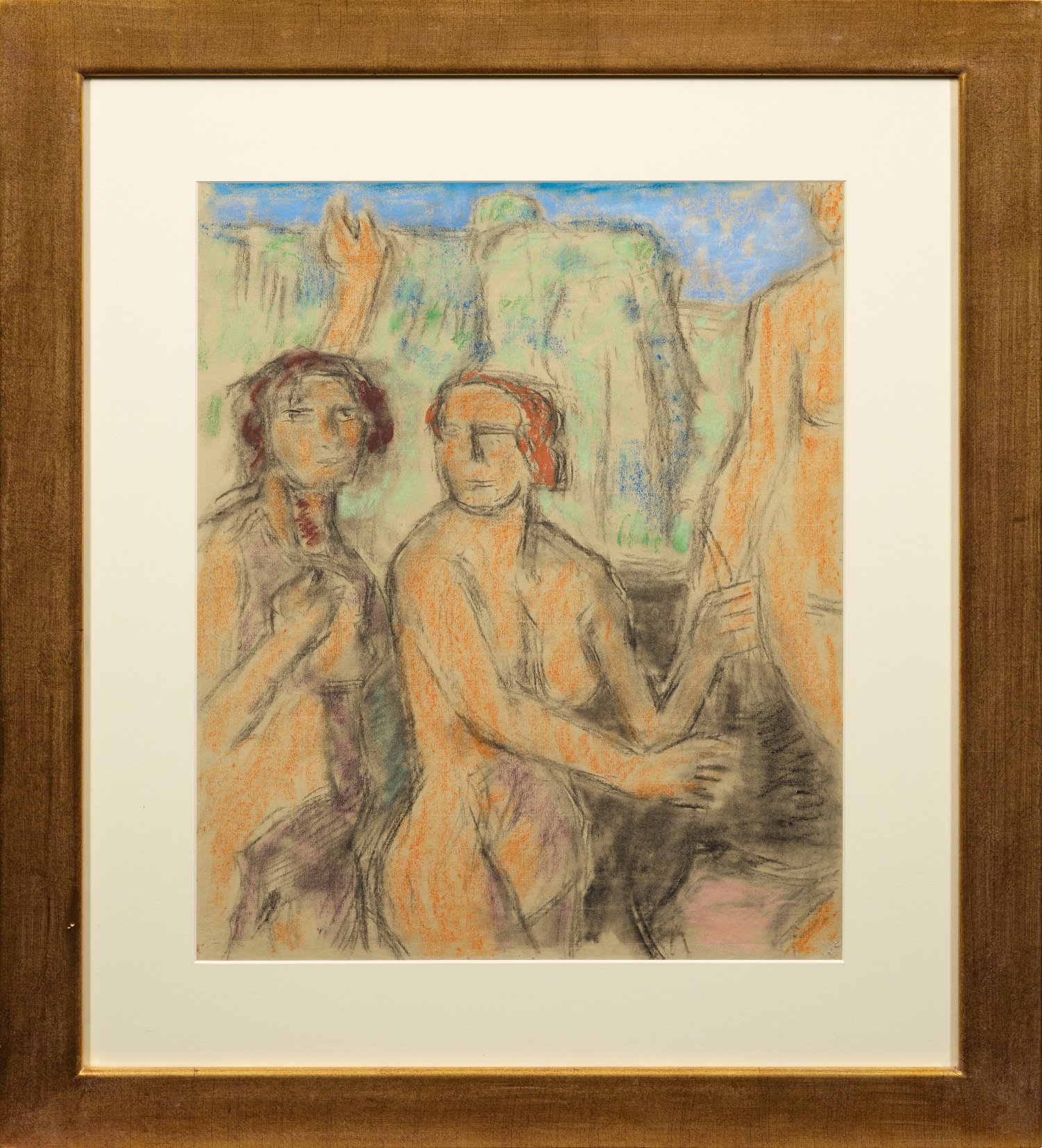Flächig angelegte, stark konturierte Aktdarstellung mit kräftiger Schattenbehandlung und zarter, pastelltoniger Kolorierung. Charakteristische, expressionistische Arbeit Kothers, die den Einfluss Max Pechsteins, Erich Heckels, Ernst Ludwig Kirchners sowie seines Freundes und Schwagers Otto Müller klar verdeutlicht. 1914 ging Kother nach Berlin, wo sich rasch erste bedeutende Erfolge einstellten. Im "Dritten Reich" gehörte auch er als Expressionist zu den verfemten "entarteten" Künstlern. Er zählt zu den bedeutenden wiederentdeckten Künstlern der sog. "verschollenen Generation". Farbkreide/chamoisfarbenes Papier. Verso handschrftliche Werk-Nr. P169. 61 cm x 47 cm (Passepartoutausschnitt). Rahmen.