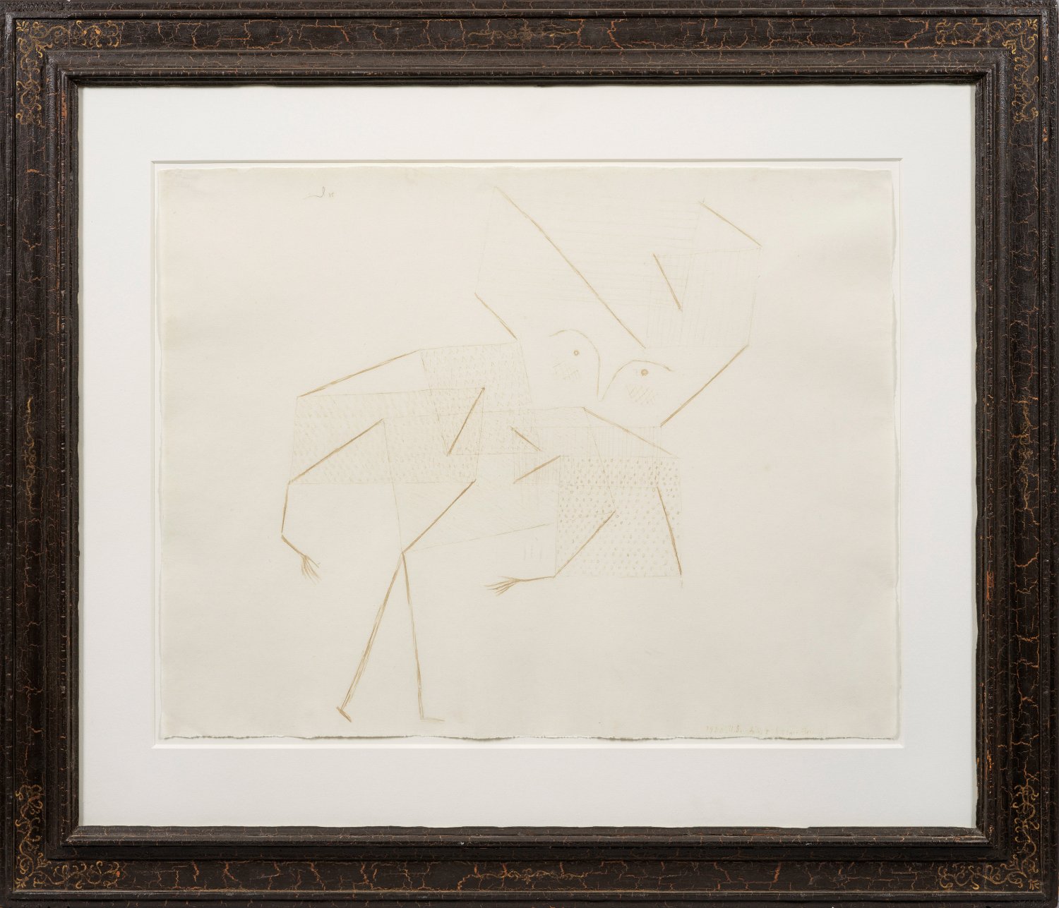 Filigran schraffierte, schwebende, sich überschneidende Flächen, die eher wie Häuser anmuten, werden durch Striche zu einem netzartigen Konstrukt verbunden, das durch die Einzeichnung einer Augen- und Nasenandeutung zu einem vogelähnlichen menschlichen Geschöpf mutiert. Dieses Motiv schuf Klee in zwei Varianten, die kleine Fassung (38/1930, U4) wurde mit Bleistift ausgeführt und fungiert als Vorstudie für die hier vorliegende, große Fassung, die ein bemerkenswertes Zeugnis von Klees künstlerischem Spiel zwischen Figuration und Abstraktion darstellt. Paul Klee, der einer der bedeutendsten, deutschen Künstler der Avantgarde vom Expressionismus bis zur abstrakten Kunst darstellt, stammte aus einem äußerst musischen Haus, entschied sich aber für eine künstlerische Laufbahn: Er ging 1898 nach München, wo er zunächst eine private Kunstschule besuchte, bis er 1900 in der Klasse von Franz von Stuck an der Akademie aufgenommen wird, die er aber nach einem Jahr bereits wieder verließ, da sie ihm zu konservativ und wenig fördernd erschien. Nach einer Italienreise kehrte er 1902 nach Bern zurück und bildete sich autodidaktisch weiter, wobei er bereits seit 1898 Tagebuch führte, in dem er seine Eindrücke und künstlerischen Ideenskizzen festhielt. 1905 folgte eine Reise nach Paris, auf der er die französische Kunst kennenlernte, und sich anschließend wieder in München niederließ. Während er anfänglich zumeist grafisch tätig war, brachten ihn die Werke von Vincent van Gogh und Paul Cézanne dazu, sich vermehrt mit der Malerei auseinanderzusetzen. 1911 machte er Bekanntschaft mit den Protagonisten des Blauen Reiters und 1912 lernte er auf einer Parisreise Robert Delaunay kennen, dessen Arbeiten ihn nachhaltig beeindruckten. Im April 1914 unternahm er zusammen mit August Macke und René Moillet eine Reise nach Tunis, auf der er sein Farbempfinden weiterentwickeln konnte und eine Reihe folgenreicher Aquarelle mit einer autonomen Bildkonstruktion, aber belebt durch gegenständliche Zeichen schuf. 1920 wurde Klee an das neugegründete Staatliche Bauhaus in Weimar berufen, wo er theoretischen Unterricht seiner bildnerischen Formlehre hielt. Neben seiner Lehrtätigkeit am Bauhaus 1920-1931 entsteht ein vielschichtiges Werk mit herausragender Erfindungsgabe von Materialien und Techniken und einer thematischen Vielfalt und gedanklichen Tiefe, die Maßstäbe setzte. 1931 wechselt Klee an die Düsseldorfer Akademie, im Zuge dessen ihm der dortige Kunstverein eine große Werkschau widmet. Nach der Machtübernahme des NS-Regimes wird Klee 1933 fristlos entlassen und kehrt nach Bern zurück, wo er erst 1937 seine künstlerische Arbeit wieder aufnimmt. Sein Spätwerk ist geprägt von kalligrafischen Zeichen und gedämpften Farbfeldern, wobei in der Komposition wieder Assoziationen des Musikalischen anklingen, das bis zuletzt sein Schaffen durchwirkt. Federzeichnung/Papier. L. ob. sign.; R. u. dat., Werknr. und betitelt "1930 U.5. Kind (große Fassung)". Verso Etikett der Martha Jackson Gallery, New York, sowie weitere Bez. und Etikett. Wvz. Grohmann 39/1930 (105 U 5). 46,5 cm x 60,8 cm. Rahmen.