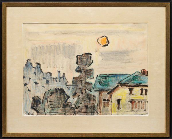 Ausdrucksstarke Landschaftsimpression, die die Stimmung eines diesigen Novembertags vortrefflich einfängt. Durch das meisterliche Zusammenspiel aus reduzierter Formensprache mit kraftvollen Konturen und vertikal und horizontal schraffierten Farbflächen entsteht eine spannungsreiche, aber absolut harmonische Komposition, die durch den Kontrast des überwiegend kalten Kolorits mit vereinzelten warmen Farbtönen exzellent gesteigert wird. Charakteristisches, spätestens 1964 entstandenes Blatt aus dem Spätwerk Schmidt-Rottluffs, das in seiner Formensprache, Farbwahl und ungebrochener Strahlkraft direkt an seine expressionistischen Landschaften der Vorkriegsjahre anknüpft. Zusammen mit Ernst Ludwig Kirchner, Erich Heckel und Fritz Bleyl, die er während seiner Studienzeit in Dresden kennenlernte, gründet er 1905 die Künstlergemeinschaft "Die Brücke", die bis 1913 besteht. Er beteiligt sich 1910 an der Ausstellung der Neuen Secession in Berlin, 1912 an der zweiten Ausstellung des "Blauen Reiter" in München und an der Sonderbund-Ausstellung in Köln. Ab 1911 in Berlin ansässig tritt Schmidt-Rottluff 1914 der Freien Secession in Berlin bei, wo er seine erste Einzelausstellung erhält. 1915 bis 1918 leistet er Kriegsdienst in Litauen und Russland und verarbeitet seine Erlebnisse später eindrucksvoll in den Holzschnitten der Nachkriegsjahre. Mit der Machtergreifung der Nationalsozialisten beginnt auch für Schmidt-Rottluff eine schwierige Zeit. Er zählt - wie die meisten Künstler der Moderne - zu den vom NS-Regime verfemten Künstlern. Bereits 1933 werden seine Werke in Museen beschlagnahmt, einige 1937 als "Entartete Kunst" öffentlich zur Schau gestellt, andere werden zerstört bzw. verbrannt. 1941 folgt schließlich durch den Ausschluss aus der Reichskammer der bildenden Künste das Berufs- bzw. Malverbot, während sein Berliner Atelier und die darin befindlichen Arbeiten den Bombardierungen der Hauptstadt zum Opfer fallen. Nach dem Zweiten Weltkrieg wird Schmidt-Rottluff vollständig rehabilitiert, erfährt höchste Ehrungen und wird 1947 als Professor an die Hochschule für Bildende Künste in Berlin-Charlottenburg berufen, wo er bis zu seiner Emeritierung 1954 lehrt. In den 1960er Jahren lebt der Künstler im Wechsel zwischen Berlin, dem Taunus und der Ostsee und es entstehen neben Stillleben eine Vielzahl an Landschaftsbildern, wobei unmittelbar umgesetzte Papierarbeiten immer mehr in den Vordergrund treten, nicht zuletzt da er 1963 die Ölmalerei gänzlich aufgibt. Mischtechnik (Tusche und Ölkreide)/Papier. L. u. sign.; Verso Werk-Nr. in grün 64/191. 40 cm x 54 cm. Rahmen.