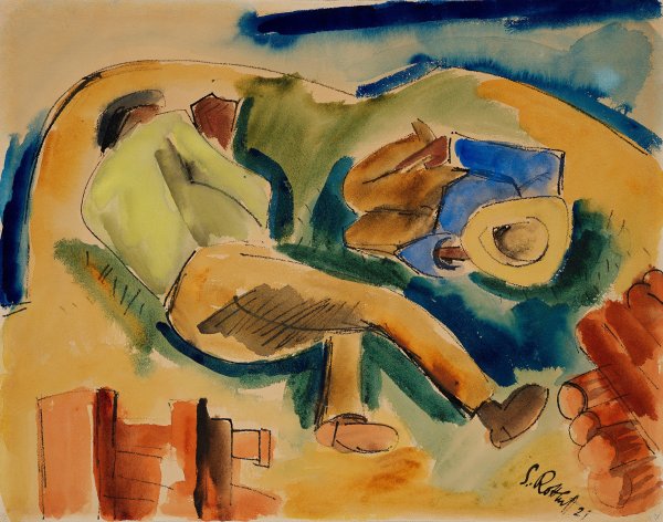 Zwei im Freien schlafende, pausierende Männer in kaum definierter landschaftlicher Umgebung erscheinen im gestisch-andeutungshaften Malvortrag zu einer ästhetischen Einheit quasi zusammengeschmolzen. Schmidt-Rottluff, einer der herausragenden Künstler der Klassischen Moderne und des Expressionismus, gehörte 1905 zu den Gründungsmitgliedern der legendären Künstlergruppe Brücke, die bis 1913 existierte. Nach der Rückkehr aus dem Ersten Weltkrieg, in dem er als Soldat gedient hat, entstand ab 1920 bis etwa 1924 eine Gruppe von Arbeiten in Öl, Aquarell und Grafik, zu der auch vorliegendes Werk gehört und in der Menschen vom Land und vom Meer in ihren täglichen Verrichtungen zentrale Themen wurden. Fischer, Bauern, Handwerker und Arbeiter werden frisch und würdevoll erfasst und in malerischer Verschmelzung mit ihrer umgebenden Landschaft wiedergegeben. Zwischen 1920 und 1932 hielt sich Schmidt-Rottluff jeden Sommer in Jershöft in Hinterpommern, heute Polen, auf. Landschaft und Mensch wurden von ihm hier als untrennbare Einheit wahrgenommen und als solche künstlerisch umgesetzt. Vorliegendes Aquarell aus dem Jahr 1921 fügt sich stilistisch und thematisch vollkommen in das Oeuvre dieser Zeit ein. Aquarell und Tusche/Bütten. R. u. sign. u. dat. (19)21. Verso Reste früherer Montierung. 41 cm x 52 cm.