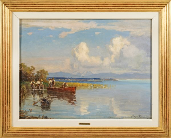 Sehr reizvolles Werk des bekannten Münchner Malers, das in der locker gemalten, atmosphärischen Landschaft einen eigenen Impressionismus zeigt. Moralt, ein nicht verwandter Großneffe Carl Spitzwegs, war ab 1905 Schüler Karl Raupps an der Akademie. Während sich viele Werke Moralts ganz an Spitzweg orientieren, zeigen die koloristisch subtilen Landschaften seit den 20er Jahren einen individuellen impressionistischen Stil, den er insbesondere an zahlreichen Motiven vom Chiemsee in Anwendung brachte. Öl/Malkarton. R. u. sign. mit Ortsangabe "Mchn." (München). 54 cm x 74 cm. Rahmen.