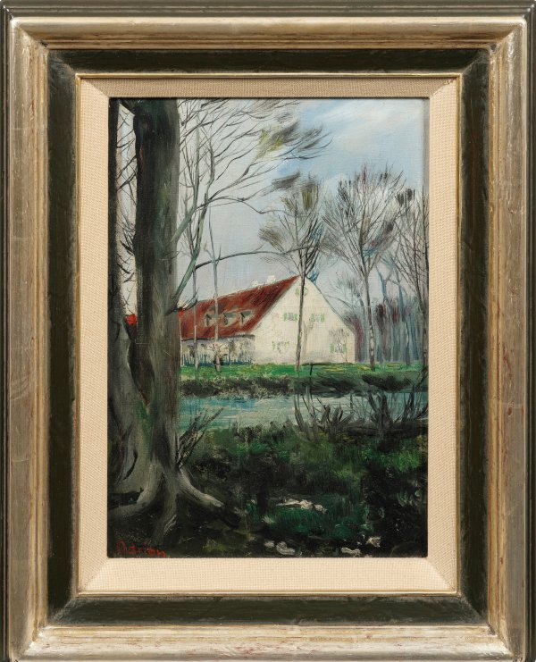 Der französische Landschafts- und Vedutenmaler Lucien Adrion ist vor allem bei Sammlern wegen seiner quirligen Parisbilder und Strandszenen der mondänen Badeorte von Normandie und Côte d'Azur beliebt. Das hier vorgestellte Motiv, mit einem klobigen, wenig formschönen Reihenhaus an einem Kanal mit blattlosen Bäumen, strahlt dagegen eine absichtsvolle Tristesse aus, wie sie vergleichbar nur noch in den Bildern der belgischen Dörfer von Maurice de Vlaminck zu finden ist. Ausgebildet bei Hermann Struck in Berlin, wurde er nach dem Ersten Weltkrieg in Paris ansässig, wo er 1921 seine erste Einzelausstellung hatte. Der Impressionist gehörte der sog. Mai-Gruppe an und wurde maßgeblich von Maurice Utrillo und Eugène Boudin beeinflusst. 1926 und 1940/41 stellte er auf dem Salon des Indépendants, Salon d' Automne und Salon des Tuileries aus. Öl/Lwd.; L. u. sign.; 41 cm x 27 cm. Rahmen.