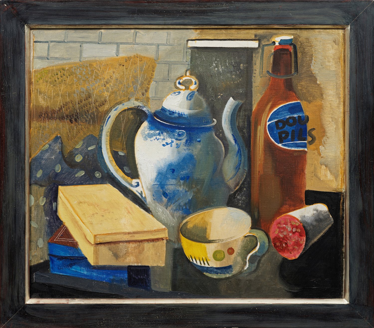 Auf einer dunklen Tischplatte hat Nussbaum bei diesem um 1935/1939 entstandenen Stillleben disparate Gegenstände arrangiert: Im Mittelpunkt eine kitschige Neorokoko-Kaffeekanne, davor als Gegensatz eine Design-Tasse mit konstruktivistischem Dekor aus der Zeit um 1930 (vermutlich ein Entwurf von Eva Zeisel), flankierend zwei blaue und gelbe Schachteln, ein weiß gepunktetes blaues Tuch sowie eine angeschnittene Salami und eine braune Bierflasche. Den Hintergrund bildet eine symbolisch den Ausweg versperrende Mauer. Stilistisch zwischen Neuer Sachlichkeit, Expressivem Realismus und Surrealismus stehend, ist dieses Stillleben nicht nur ästhetisch zu verstehen, sondern auch als Ausdruck der Lebensrealität des Künstlers zu interpretieren. Dieses Hauptwerk spiegelt geradezu die Bedrängnisse sowie äußerliche und innerliche Zerrissenheit wider, in der sich Nussbaum befand: Als deutscher Künstler jüdischen Glaubens musste er 1933 vor den Nationalsozialisten fliehen und emigrieren, lebte mit seiner Frau im Exil, seit 1937 in Brüssel, bis beide schließlich im Juni 1944 inhaftiert und nach Auschwitz deportiert wurden. Der geschilderte Kaffeegenuss liegt zwischen Bürgerlichkeit (Kaffeekanne) und Moderne (Kaffeetasse), das proletarische Flaschenbier mit dem Schriftzug "DOU(X) PILS" und die Wurst dienen dagegen der einfachen, schnellen Trink- und Essensbefriedigung, wie sie auch im Versteck und auf der Flucht möglich war. Der eigenen Verlorenheit, Orientierungslosigkeit und Irritation entsprechend sind mehrere, einander widersprechende Perspektiven erkennbar, die teilw. deformierten Gegenstände scheinen ohne festen Halt zu schweben. Augenfällig wird der Schriftzug des Etiketts über die Flasche hinweg weitergeführt, doch "süß" oder "sanft" - wie das Bieretikett vermuten lässt - war das Leben Nussbaums zur Entstehungszeit um 1939 durchaus nicht mehr. Öl/Lwd., doubliert; Verso Papieretikett mit handschriftlichen Vermerken (von fremder Hand). Wvz. Junk/Zimmer 142. Online Wvz. Felix Nussbaum, hrsg. von der Felix Nussbaum Foundation, Nr. 363. 49,5 cm x 56,5 cm. Rahmen.