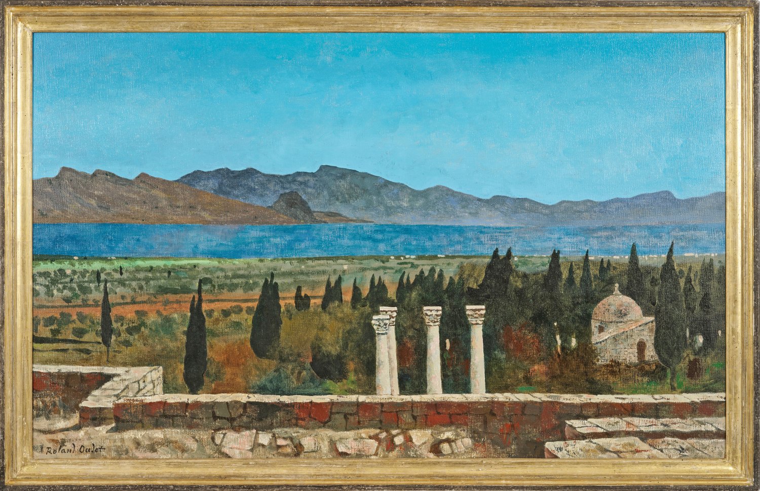 Das dem griechischen Gott Asklepios (Äskulap) geweihte Heiligtum auf der Insel Kos wird im Vordergrund nur knapp vom Blick des Betrachters tangiert, während sich in der Bildtiefe eine Meeresbucht eröffnet, über die sich ein intensiv blau strahlender, mediterraner Himmel wölbt. Der Spätimpressionist Oudot war 1915-1923 Assistent von Léon Bakst bei den Ballets Russes, der ihn mit den Gemälden Paul Cézannes, Pierre Bonnards und Édouard Vuillards vertraut machte. Beeinflusst von der französischen Kunst der Moderne und zugleich in der Tradition von Camille Corot, entwickelte er seinen eigenen Stil. 1919 debütierte Oudot auf dem Salon d'Automne, es folgten zahlreiche Einzelausstellungen und Ausstellungsbeteiligungen, u. a. bei der Biennale in Venedig. 1935 schloss sich Oudot der Künstlergruppe "Les peintres de la réalité poétique" (Maler der poetischen Realität) an. L. u. sign.; Öl/Lwd.; Verso Galerieetikett des Kunsthauses Bühler, Stuttgart. 81 cm x 130 cm. Rahmen.