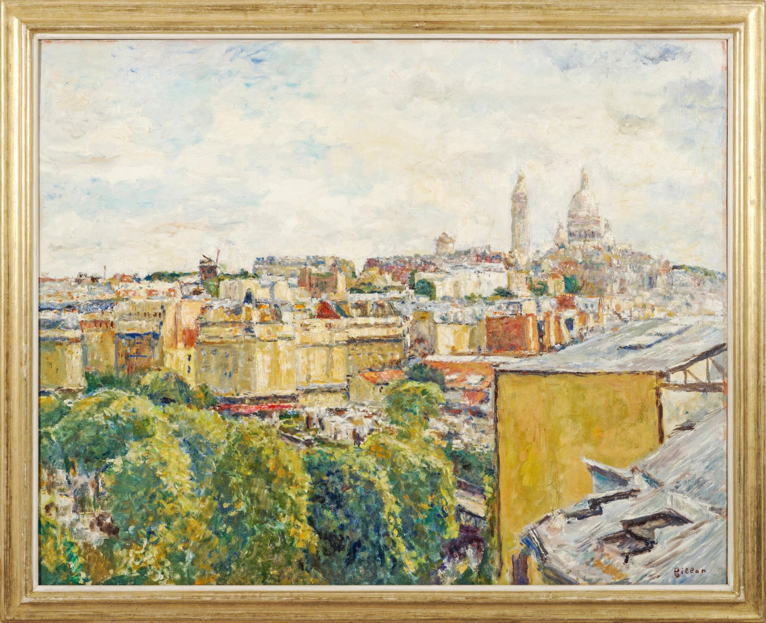 Von einem erhöhten Standpunkt aus gesehener Panoramablick auf das herbstliche Paris mit der 1919 geweihten Basilika Sacré-Cœur de Montmartre auf dem Gipfel des Montmartre-Hügels. Die einzige noch heute erhaltene Mühle, die Moulin Galette Rouge erhebt sich über dem Häusermeer des Pariser Stadtviertels Montmartre, indem nach 1900 vor allem verarmte Künstler, Literaten und andere Lebenskünstler günstige Wohnungen fanden. Die flächig angelegte Komposition lässt noch deutlich den Einfluss von Cézanne und der Fauves erahnen. Ausgebildet an der École des Beaux-Arts in Marseille, ging Arthur Fillon 1918 nach Paris, wo er im Atelier von Ernest Laurent lernte. Ab 1924 beteiligte sich Fillon regelmäßig am Salon d'Automne und Salon des Indépendants. Anfänglich bevorzugte er Themen rund um die Zirkuswelt und wandte sich im Laufe der Jahre immer mehr den gefragten Parisansichten, sommerlichen Landschaften und der Stilllebenmalerei zu. Auch sein Malstil erfuhr einen deutlichen Wandel hin zu einer impressionistischen Sichtweise. Öl/Lwd.; R. u. sign.; Galerieetikett. 72,5 cm x 92 cm. Rahmen.