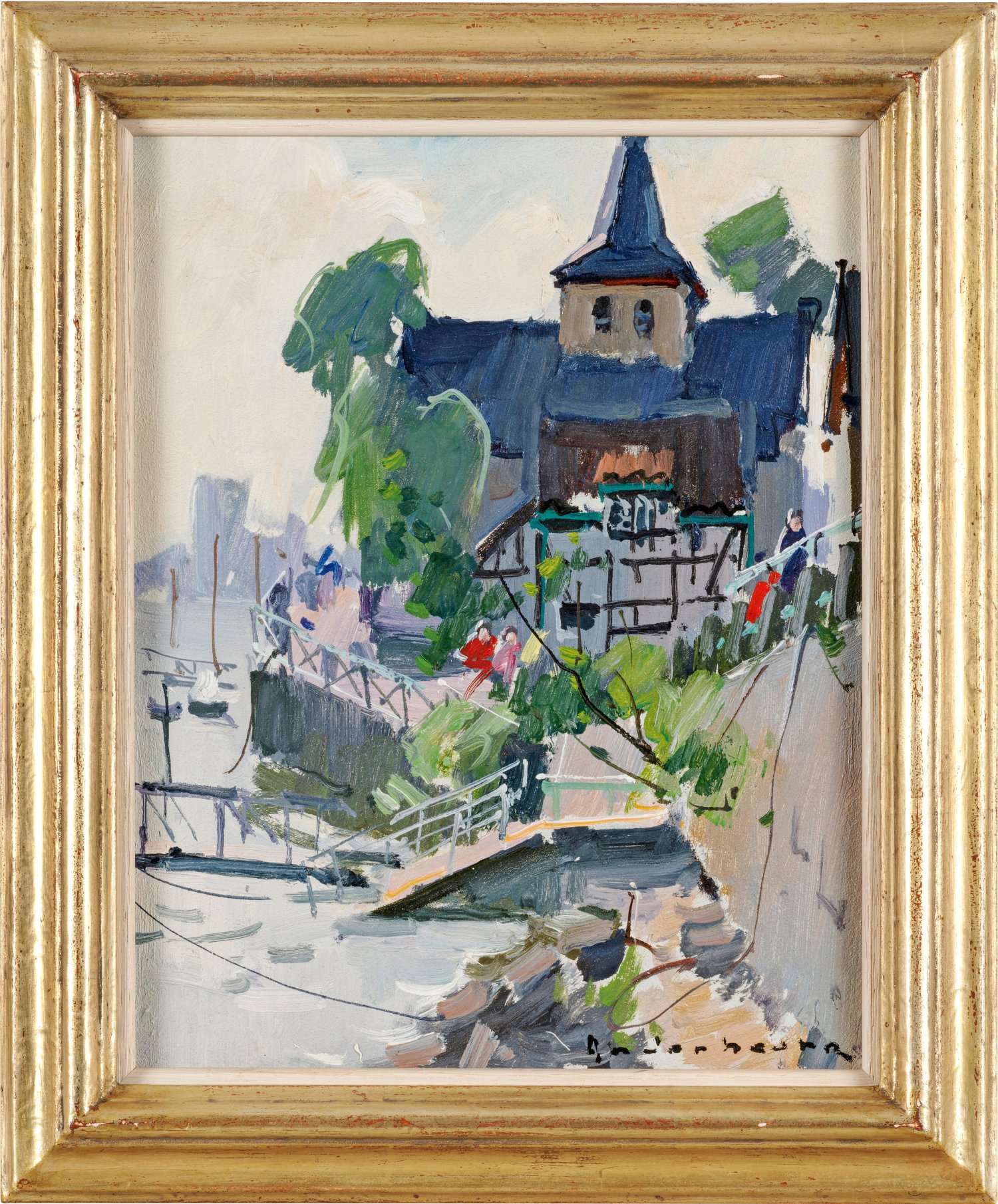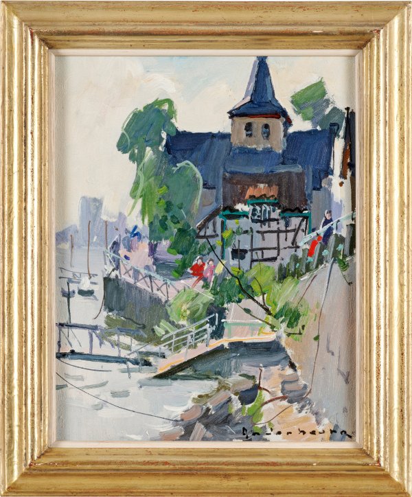 Mit schnellem, breitem Duktus gemalte Vedute des Spätimpressionisten, der sich als Städte- und Vedutenmaler hervorgetan hat. In der koloristisch subtil abgestimmten Heidelberg-Ansicht kommt seine Bewunderung für sein großes Vorbild Claude Monet zum Ausdruck. Anderbouhr stellte 1937/38 erstmals im Salon d'Automne in Paris aus und hatte zwischen 1953 und 1973 elf Einzelausstellungen in der renommierten Galerie Durand-Ruel in Paris, danach viele in den USA. Öl/Pappe. R. u. sign.; Verso maschinenschriftliches Galerieetikett mit Bildangaben. 30 cm x 23,5 cm. Rahmen.