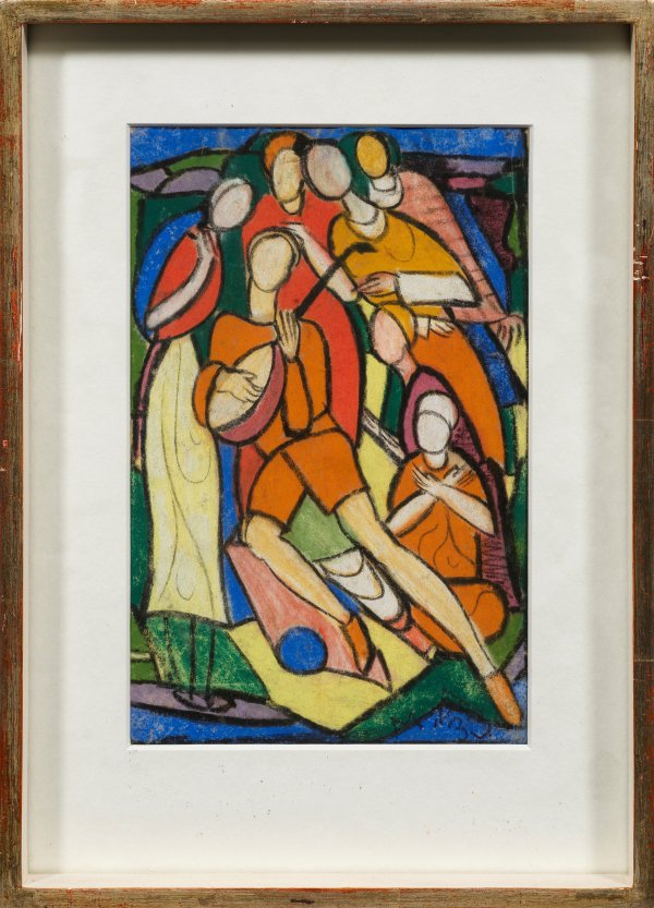 In leuchtenden Farben, rhythmischer Komposition und dynamischen Flächen konzipiertes Blatt als Entwurf für ein Glasfenster, das thematisch an frühe Tanz- und Spielszenen anknüpft, die Ackermann - inspiriert durch die Wandervogelbewegung - ab 1914 schuf. Der in Berlin geborene Künstler war Schüler bei Henry van de Velde in Weimar, Richard Müller in Dresden, Franz von Stuck in München und Richard Pötzelsberger in Stuttgart, wo er neben Willi Baumeister auch Adolf Hölzel kennenlernte, zu dem er ab 1912 eine sehr enge Bindung pflegte, die auch seinen künstlerischen Werdegang nachhaltig prägte. So ist auch in dem vorliegenden Blatt Hölzels Einfluss auf Ackermanns Formensprache und Farbbehandlung deutlich ablesbar. Farbkreide auf Papier. R. u. monogr. und dat. (19)33. Auf der Rahmenabdeckung rücks. von fremder Hand bez. sowie mit Vermerk der Werknummer ACK 2955. Blatt ca. 25,5 cm x 16,5 cm. 24,5 cm x 15,8 cm (Passepartoutausschnitt). Rahmen.