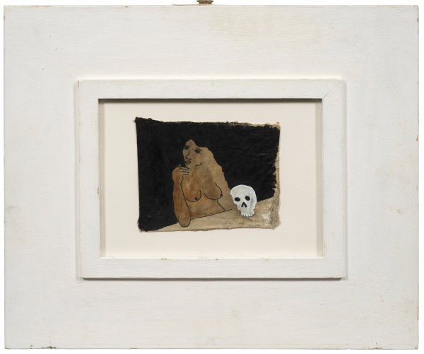 Stark reduzierte, von Matisse und dem Fauvismus inspirierte Darstellung eines weiblichen Halbakts vor einem Totenschädel, welche auch als büßende Magdalena interpretiert werden kann. Nach dem Studium der Malerei in Chile ließ sich Belmar in München nieder, wo er insbesondere von der Galerie Biedermann vertreten wird. Chinatusche und Deckweiß, laviert/Pappe. Bez. auf dem Rückseitenschutz. 11,8 cm x 14,5 cm. Rahmen.