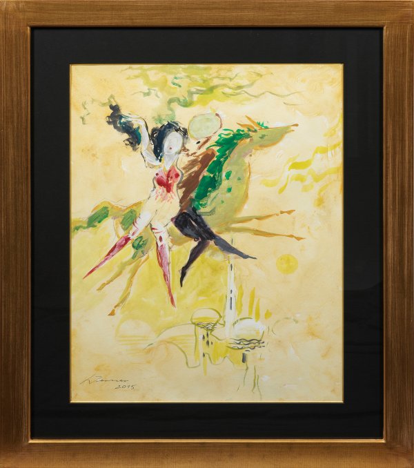 Über einer orientalischen Stadt schwebende Reiterin auf ihrem Zauberpferd. Phantasievolles, märchenhaftes Motiv Werners, der als Maler, Grafiker und Porzellan-Künstler arbeitete. Er war neben Rudi Stolle, Peter Strang und Ludwig Zepner prägend für die Entwicklung der Meissener Manufaktur und lehrte ab 1978 als Professor an der Hochschule für Kunst und Design Burg Giebichenstein in Halle (Saale). 1967-1988 beteiligte er sich an allen Kunstausstellungen der DDR in Dresden. Aquarell/Bütten. L. u. sign. und dat. 2015. Wvz. 4946. 75 cm x 55 cm (Passepartoutausschnitt). Rahmen.