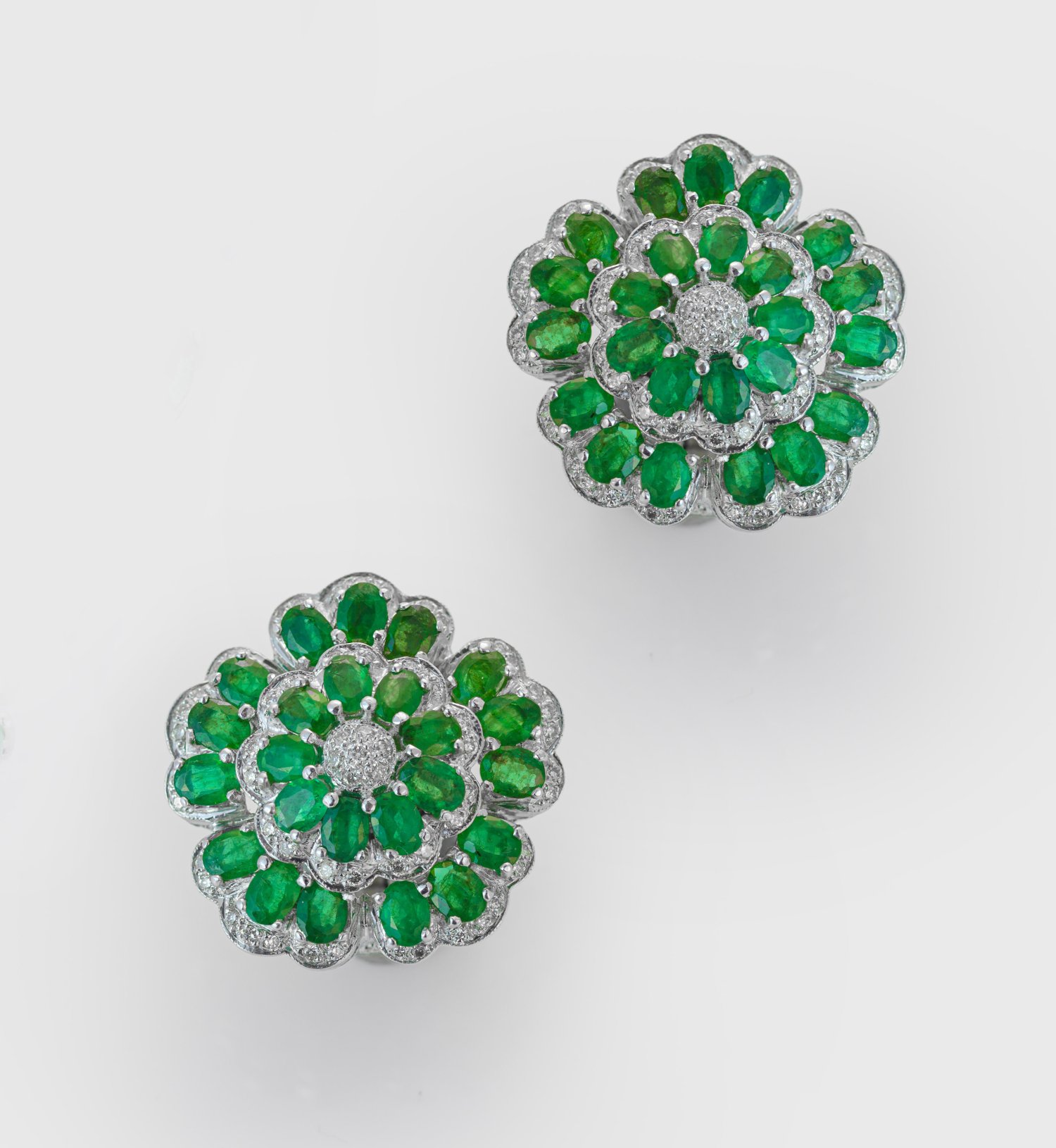 Pair of earrings set with emeralds approx. 7,00 ct. and small diamonds, in 18 k white gold.
