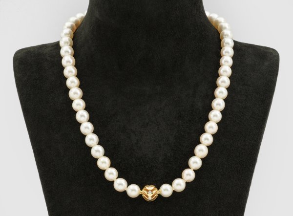 Gelbgold, 18 k. Einreihige Kette besetzt mit weißen Perlen von ca. 8 mm, in farbintensivem, rosé-grün changierendem Lüster. Schließe mit kleinen Brillanten. L. ca. 42 cm. Gew. ca. 42,72 g.
