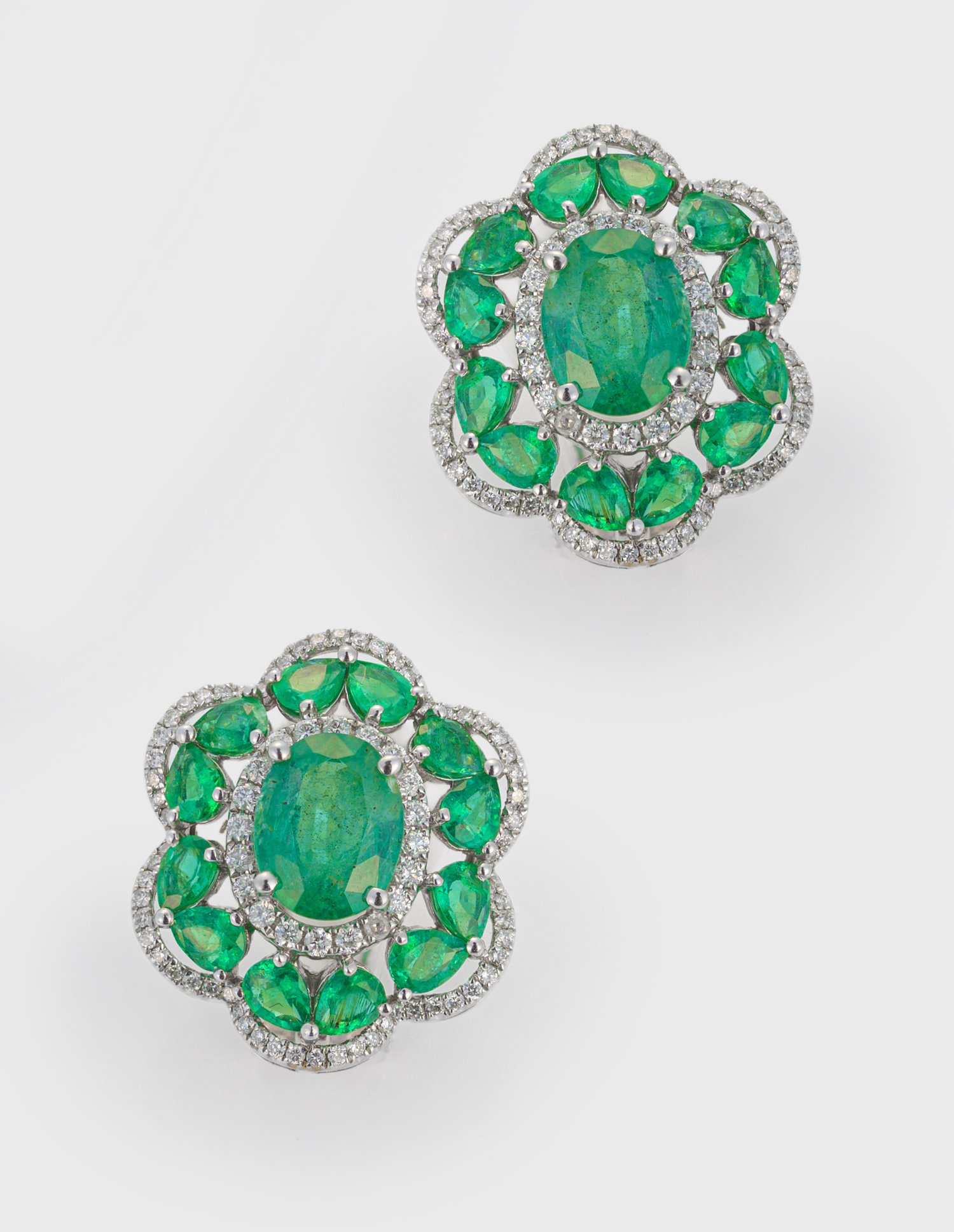 Pair of earclips set with emeralds approx. 5,80 ct. and diamonds approx. 0,84 ct. (G-H/si), in 18 k white gold.