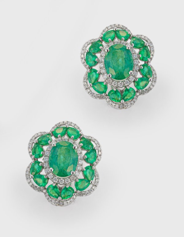 Weißgold, gest. 750. Schauseitig besetzt mit leuchtendgrünen Smaragden von zus. ca. 5,80 ct. im Ovalschliff, entouriert von Brillanten von zus. ca. 0,84 ct. (G-H/vs). Ges.-Gew. ca. 10,18 g.