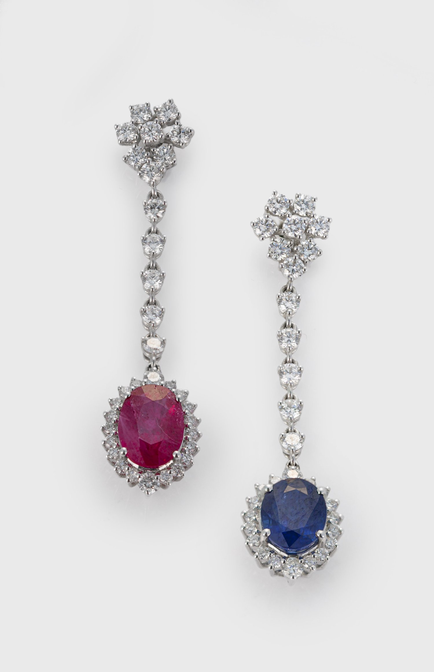 Pair of earrings set with a royal blue sapphire approx. 2,62 ct., a pigeon blood red ruby approx. 2,07 ct. and diamonds approx. 2,00 ct., in 18 k white gold. Certificate included.