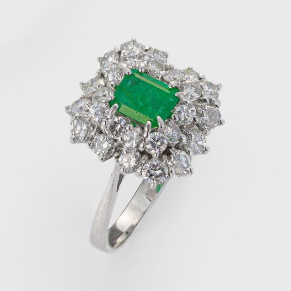 Weißgold, gest. 750. Zentral besetzt mit einem Smaragd von ca. 0,50 ct., entouriert von Brillanten von zus. ca. 0,95 ct. (F-G/W/vs-pi). Gew. ca. 3,85 g.