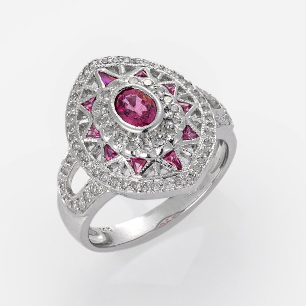 Weißgold, gest. 585. Zentral besetzt mit framboisefarbenem Rubin von ca. 0,40 ct. im Ovalschliff, entouriert von korrespondierenden, kleinen Rubinen und Diamanten. Gew. ca. 6,52 g.