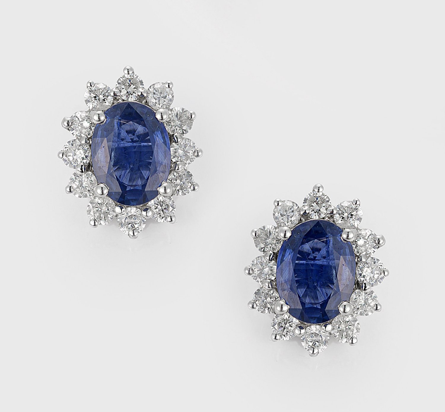 Pair of earrings set with nearly cornflower blue sapphires approx. 2,50 ct. and diamonds approx. 1,00 ct. (H/si), in 18 k white gold.