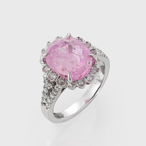 Weißgold, gest. 750. Zentral besetzt mit einem unbehandelten, pinkfarbenen Saphir von ca. 9,02 ct., entouriert von Brillanten von zus. ca. 0,68 ct.; Gew. ca. 7,69 g.