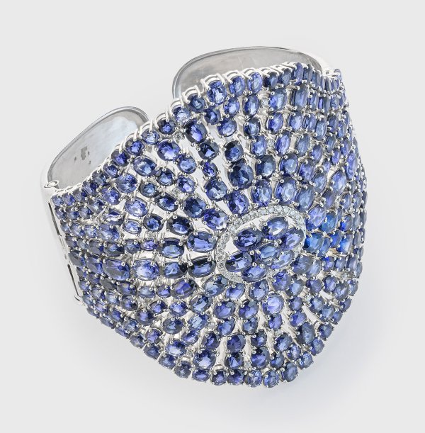 Bracelet set with nearly cornflower blue sapphires approx. 80 ct. and diamonds approx. 0,90 ct., in 18 k white gold.