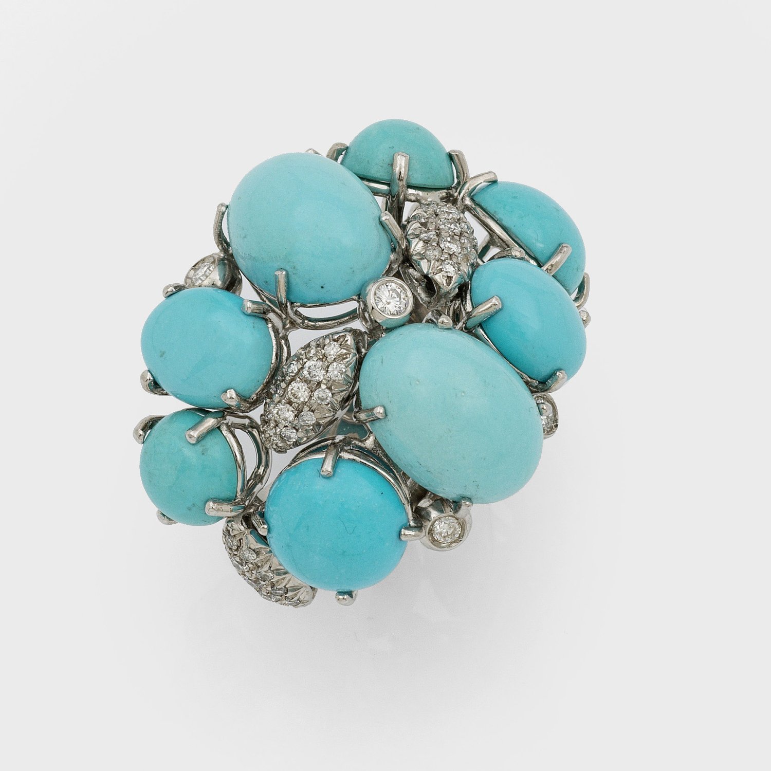Weißgold, gest. 750. Besetzt mit türkisblauen persischen Türkis-Cabochons, akzentuiert durch Brillanten von zus. ca. 1,00 ct.; Gew. ca. 23,90 g.