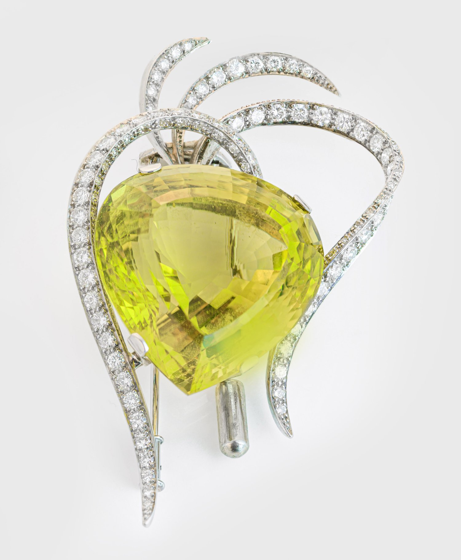 Weißgold, gest. 750. Besetzt mit einem limonenfarbenem Citrin von ca. 62 ct. in Briolettschliff, akzentuiert durch Brillanten von zus. ca. 2,60 ct. (H-Ivs/vvs). Gew. ca. 37,70 g.