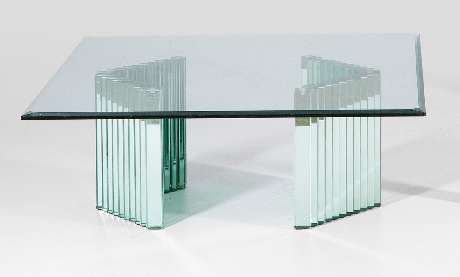 Spiegelglas und farbloses Glas. Pfeilartig angelegte Stützen aus gestaffelt angeordneten, kräftigen Spiegelelementen als Träger für quadratische, facettierte Deckplatte. Entw. Luigi Massoni, 1980er Jahre. H. 37 cm. 100 cm x 100 cm.