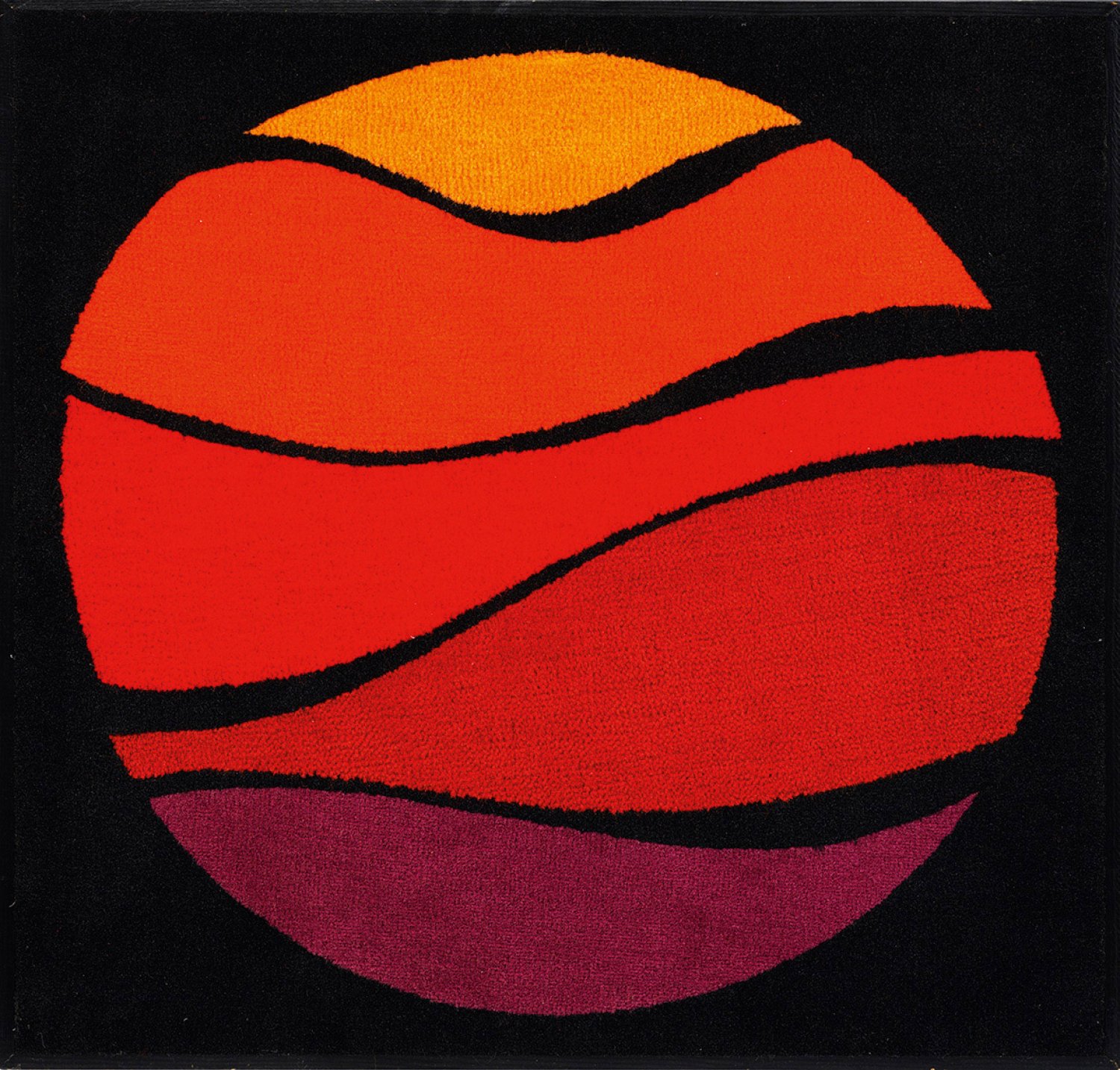 Polyamidgewebe, aufgelegt auf Platte. Auf schwarzem Fond das Kreismotiv zusammengesetzt aus wellenförmigen Segmenten in Orange, Rot und Violett. Verso auf Atelieretikett bez. mit Werknr. 1026, Titel, datiert, Nummer 26/75 sowie sign.; 70 cm x 70 cm. Rahmenleisten.
