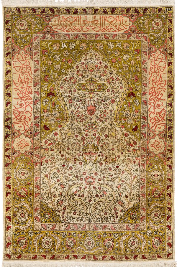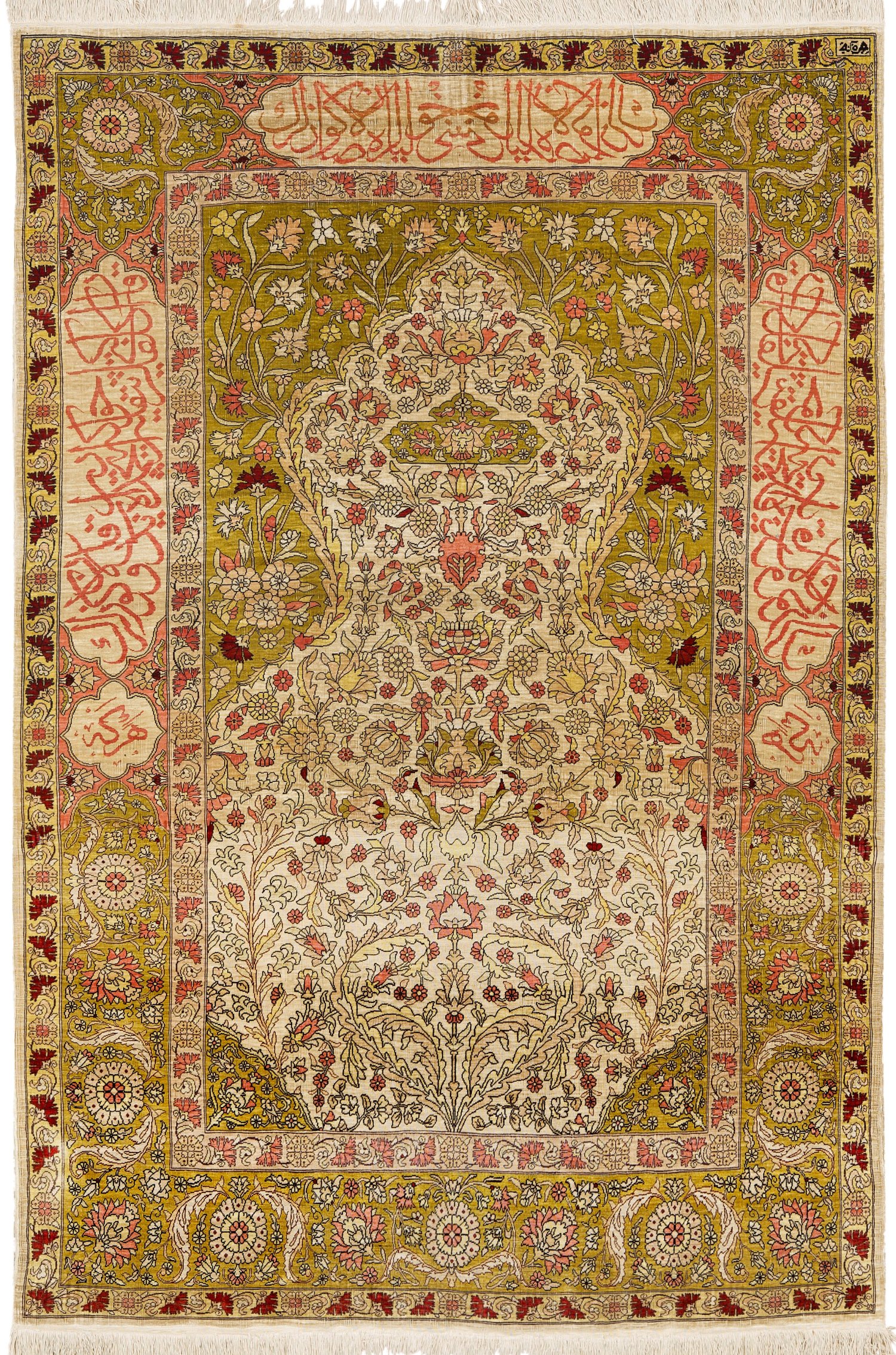 Türkei. Seide auf Seide. Im hellen Innenfeld passig geschweifte Nische mit flächendeckend dicht angeordneter Blütenmusterung. Umlaufend breite Bordüre aus Palmetten und großen Kartuschen mit Koranversen, begrenzt von Blütenbändern. Sign.; Belaufen.154 cm x 106 cm.