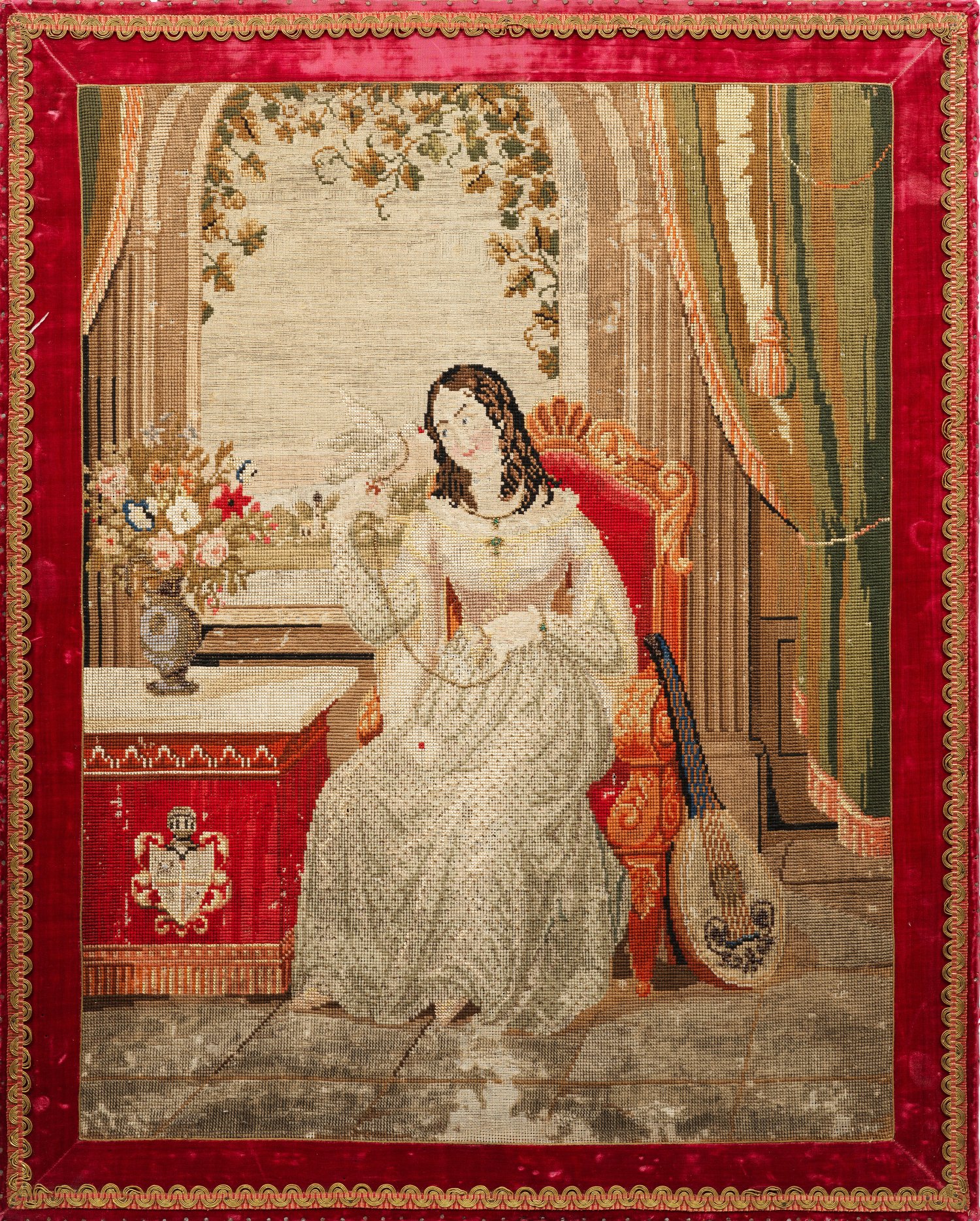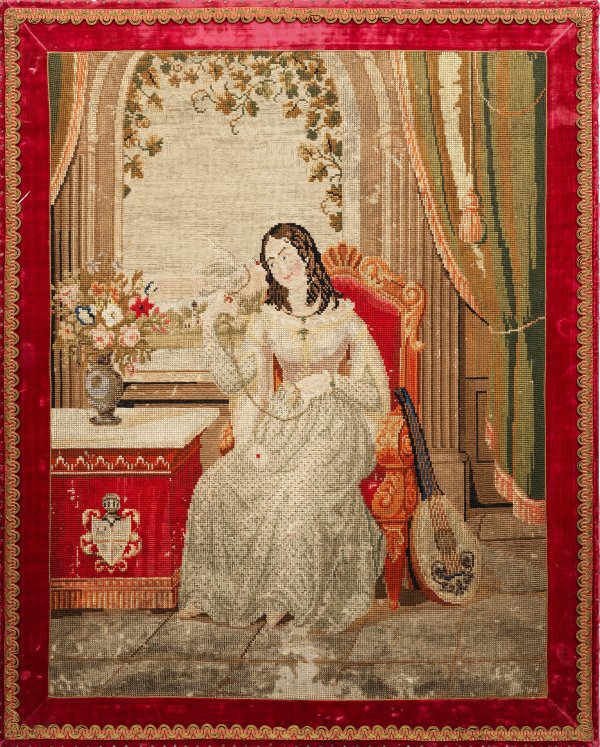 Wolle in sog. Needlepoint-Stickerei mit umlaufender Samtbordüre und Brokatband. In einem höfischen Interieur, vor einem Fenster sitzende junge Frau mit weißer Brieftaube und einer Laute neben ihr vor einem Fenster. 91 cm x 72,3 cm.