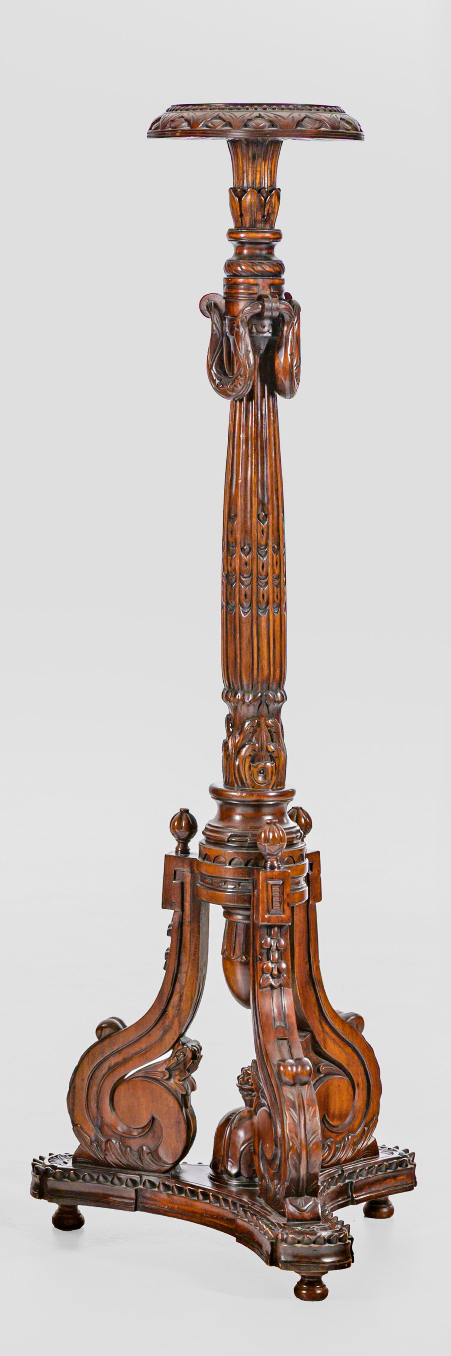 Mahagoni, reliefplastisch geschnitzt. Über dreiseitig konkav eingezogener, umlaufend profilierter Zarge schräggestellte, eingerollte Voluten. Oberhalb davon ausgehend mehrfach gegliederter Balusterschaft mit Festonmotiven als Träger für runde Abstellfläche. H. 146 cm.