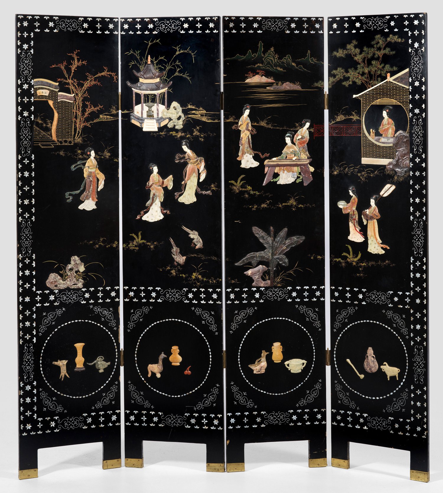 4-tlg.; Flächendeckender Fond aus Schwarzlack sowie Applikationen aus unterschiedlich farbigen Specksteinen, Perlmutt, Knochen und Kunststoff. Gerade hochrechteckige Paneele, schauseitig mit flächendeckender, figural angelegter Palastszenerie, begrenzt von offen gestalteten Ornamentbändern. Rückseitig gemalter Blütendekor. Pro Paneel: 183 cm x 40 cm.