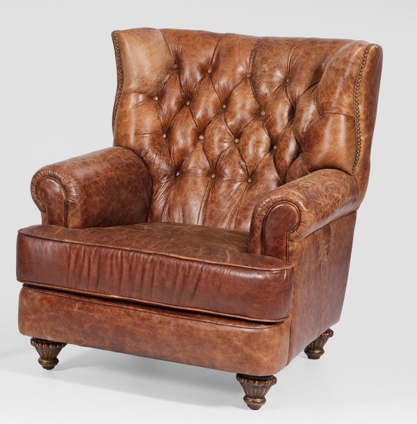 Braunes Leder. Gekanteter Korpus auf kurzen godronierten Balusterfüßen. Breite gerundete Armlehnen sowie hohe, zurückschwingende Rückenlehne mit Knopfpolsterung. H. 107 cm. 106 cm x 100 cm. Sitz-H. 48 cm.