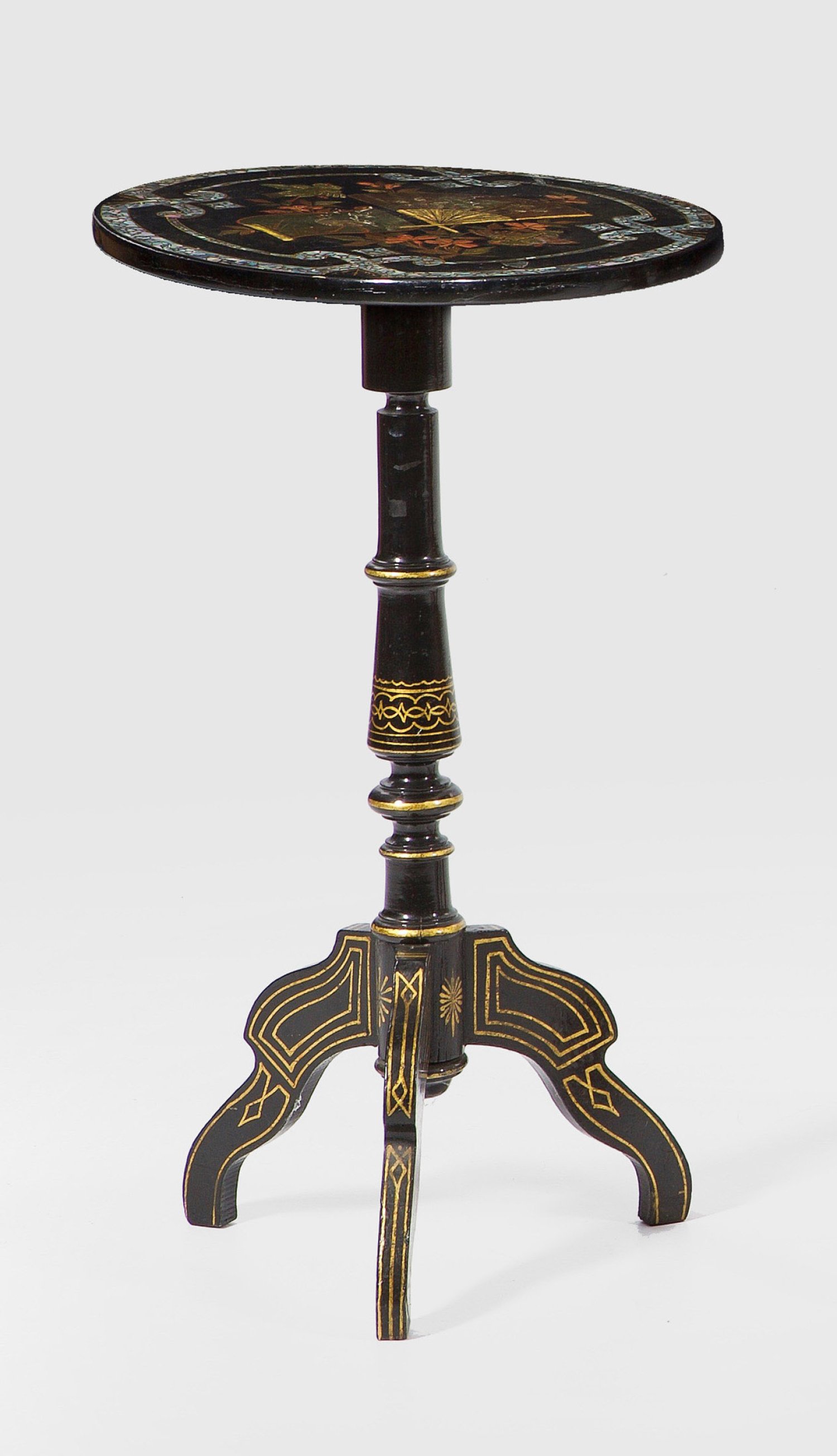 Holz und Papiermaché, polychrom bemalt sowie Einlagen aus Perlmutt. Mehrfach gegliederter Balusterschaft auf geschweiften Beinen als Träger für runde, abklappbare Deckplatte mit erhaben reliefiertem Fächermotiv, Blütenzweig und Vögeln, umgeben von Bandeinlagen. H. 72 cm. D. 41 cm.