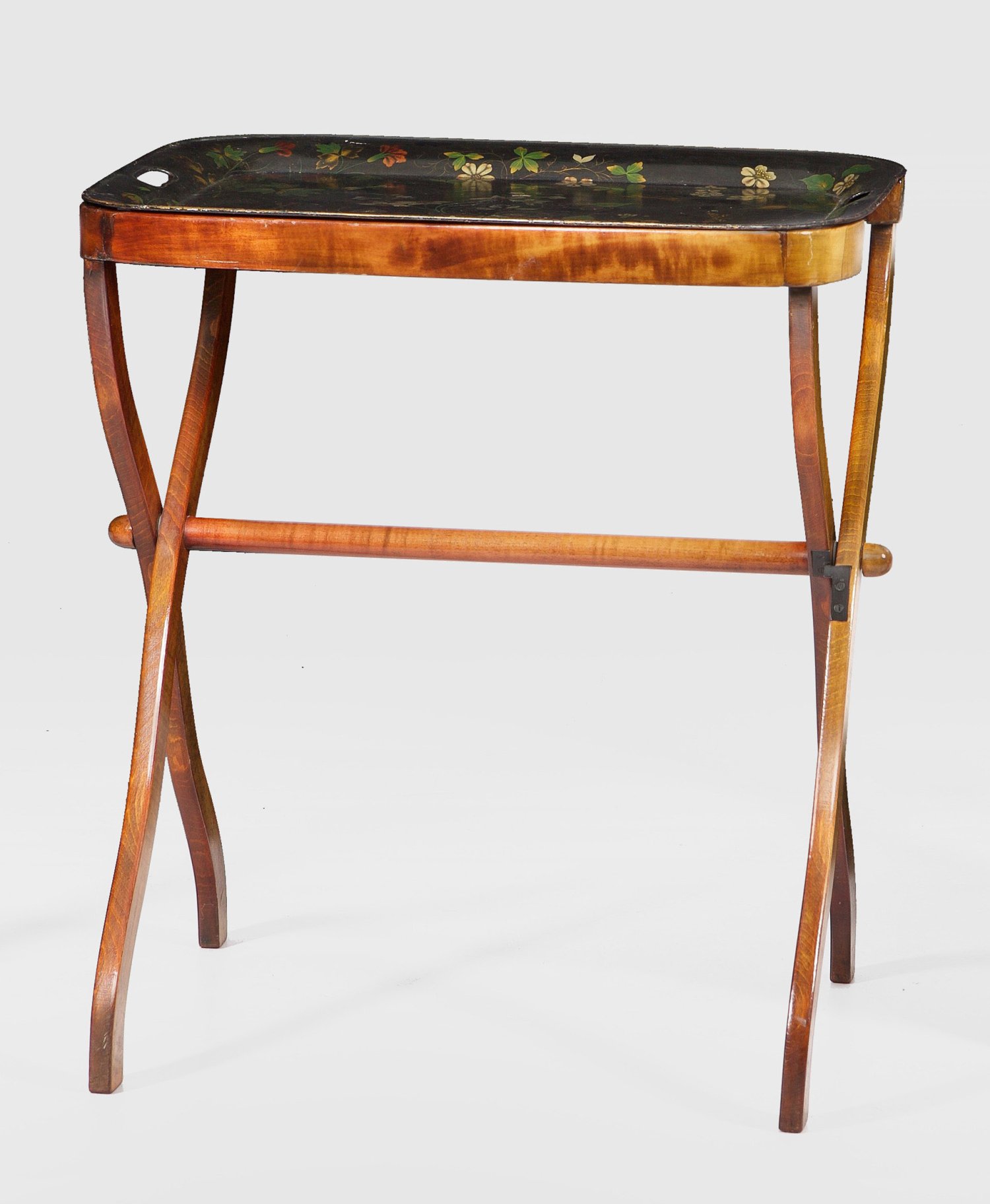 Mahagoni und schwarz lackiertes Metall. Scherenartig angelegtes, faltbares Gestell mit gerundeter Zarge als Träger für flach gemuldetes, abnehmbares Tablett mit flächendeckendem Dekor aus Blüten und Insekten. H. 76 cm. 67 cm x 49 cm.
