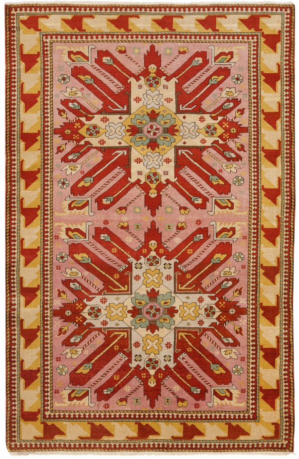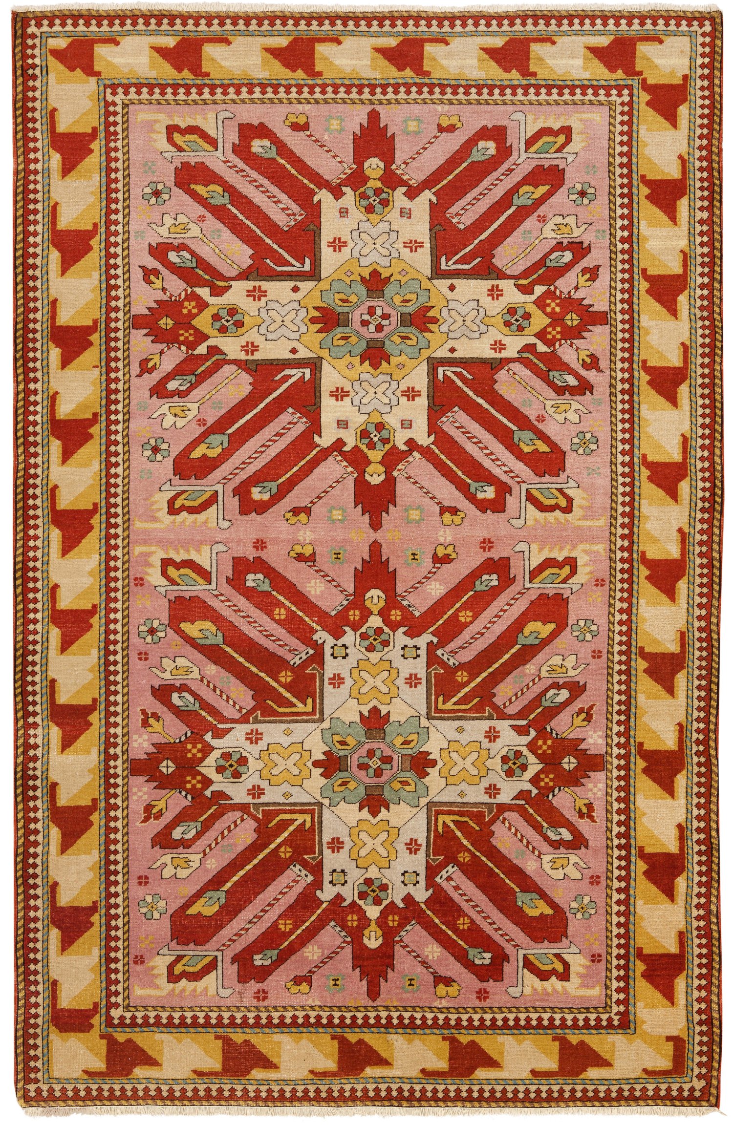Türkei. Wolle auf Wolle. Im roséfarbenen Innenfeld zwei große, stilisierte Adlermotive in Rot- und Beigetönen. Umlaufend breite, rot-gelbe Ornamentbordüre. 226 cm x 154 cm.