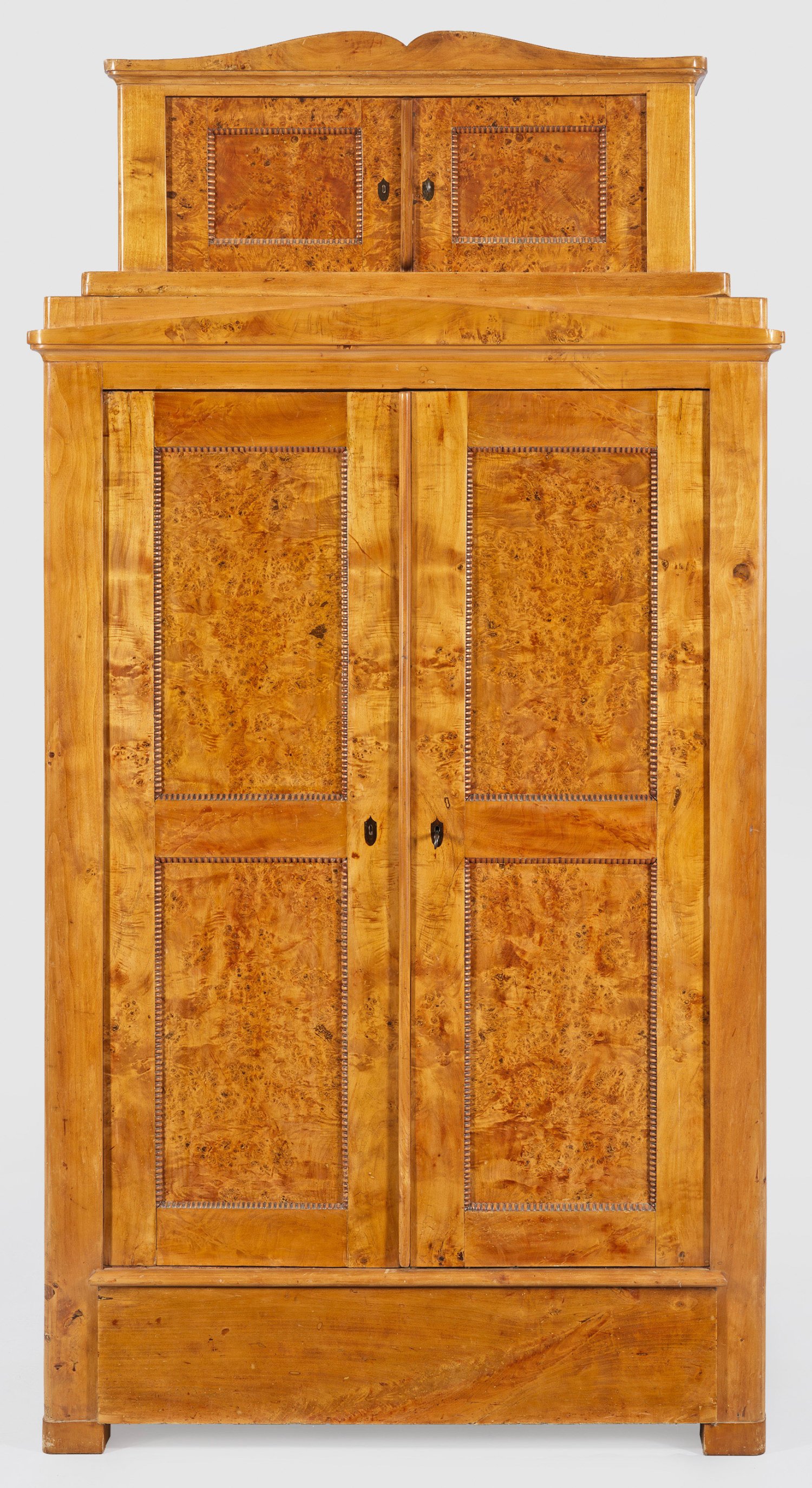 Birkenholz und Birkenmaser, furniert. Gerader, hochrechteckiger Korpus mit gerundeten Ecken auf flachen Füßen. In der gegliederten Front breites Schubfach sowie zwei Türen. Oberhalb korrespondierender zweitüriger Aufsatz mit geschweiftem oberen Abschluss. H. 218 cm. 115 cm x 54 cm.