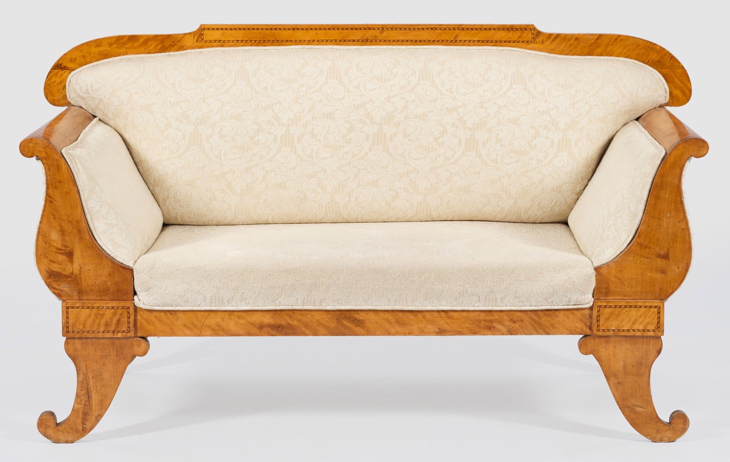 Birkenholz. Gerade Zarge auf flachen, ausgestellten Füßen. Ausschwingende Armlehnen sowie gewölbte Rückenlehnenrahmung. Gepolstert und bezogen. H. 100 cm. 181 cm x 64 cm. Sitz-H. 46 cm.