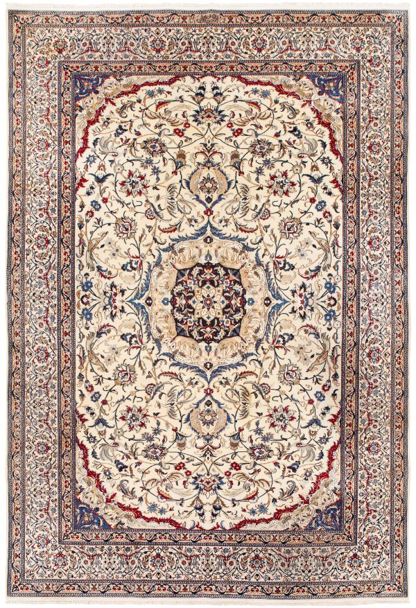 Persien. Wolle mit Seide auf Baumwolle. Feine Knüpfung. Im cremefarbenen Innenfeld großes Zentralmedaillon mit Anhängern sowie passig geschweifte Ecklösungen. Flächendeckend dichte Musterung aus üppigen Blattranken und Phönixen. Umlaufend breite Bordüre aus dichten Palmettenranken, flankiert von schmalen Bändern. Sign.; 299 cm x 189 cm.