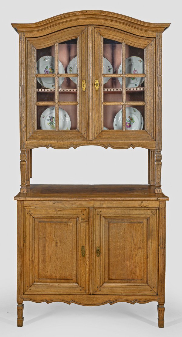 Eichenholz. Querrechteckig angelegter, zweitüriger Korpus mit kassettierten Füllungen, auf kannelierten Balusterbeinen. Oberhalb korrespondierender, sprossenverglaster Vitrinenaufsatz mit geschweift ansteigendem Gesims. Spätere Erg.; H. 187 cm. 99 cm x 51 cm.