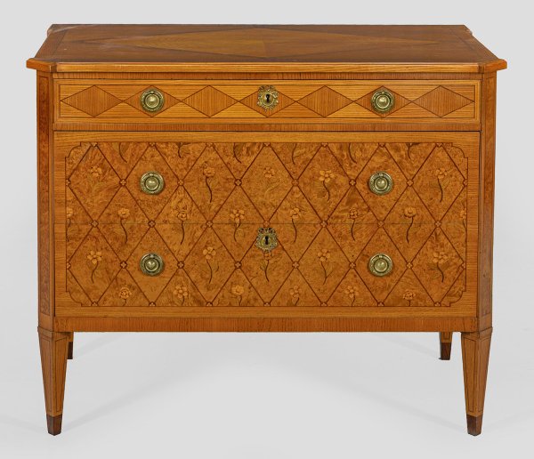 Rüster, furniert. Gerader, querrechteckig angelegter Korpus, flankiert von schräggestellten Ecklisenen auf konischen Vierkantbeinen. In der gegliederten Front, teilw. optisch verbundene Schubladen unterschiedlicher Größe. Gering überstehende Deckplatte. Flächendeckend gespiegelt angeordnete Furnierfelder sowie Einlagen aus Rauten. H. 80,5 cm. 100 cm x 54 cm.