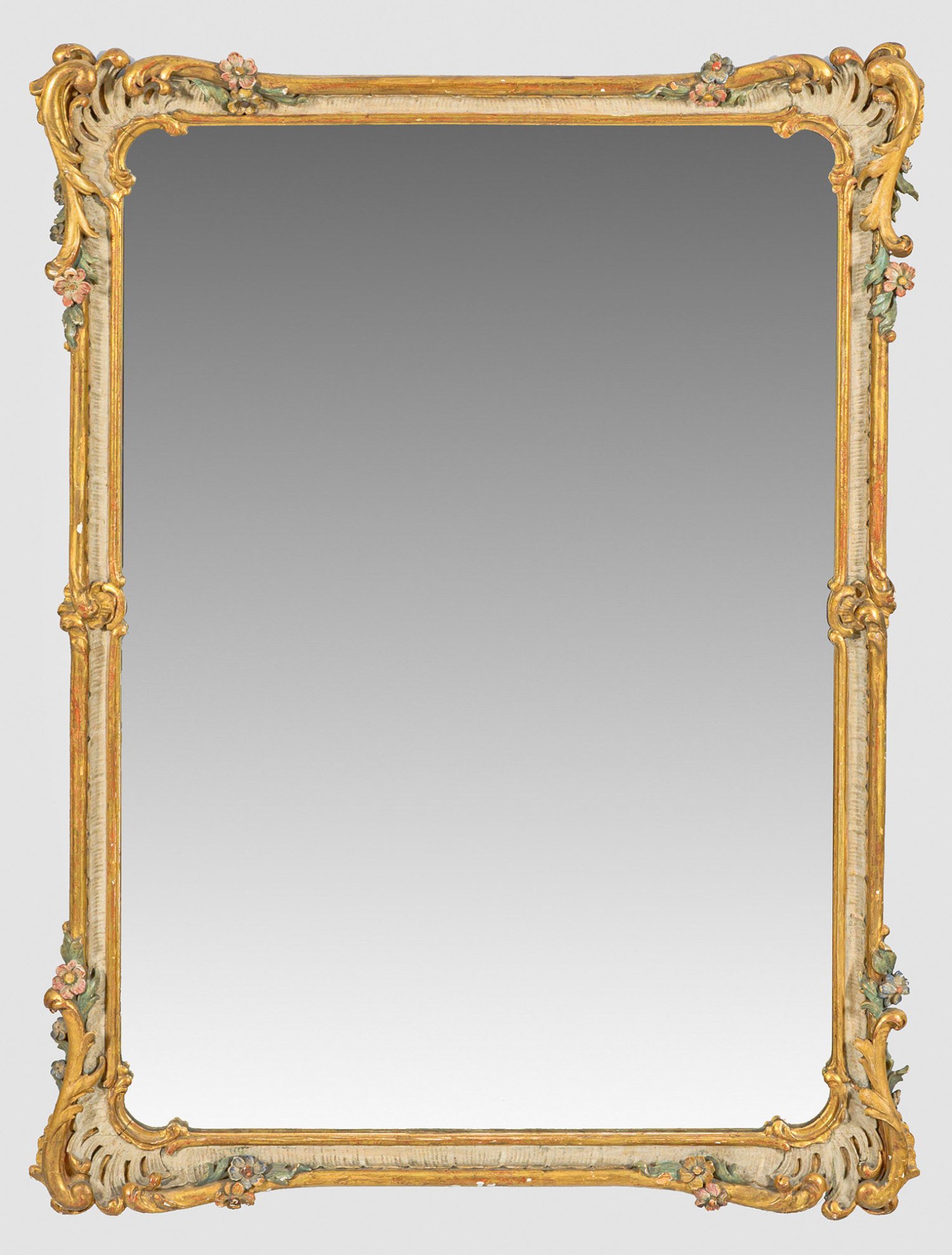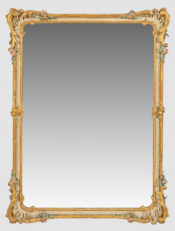 Holz, geschnitzt, gefasst und vergoldet. Rechteckige Spiegelrahmung aus gestreckten Voluten mit verkröpften Ecken aus großen Rocaillen und Blüten. 106 cm x 81 cm.
