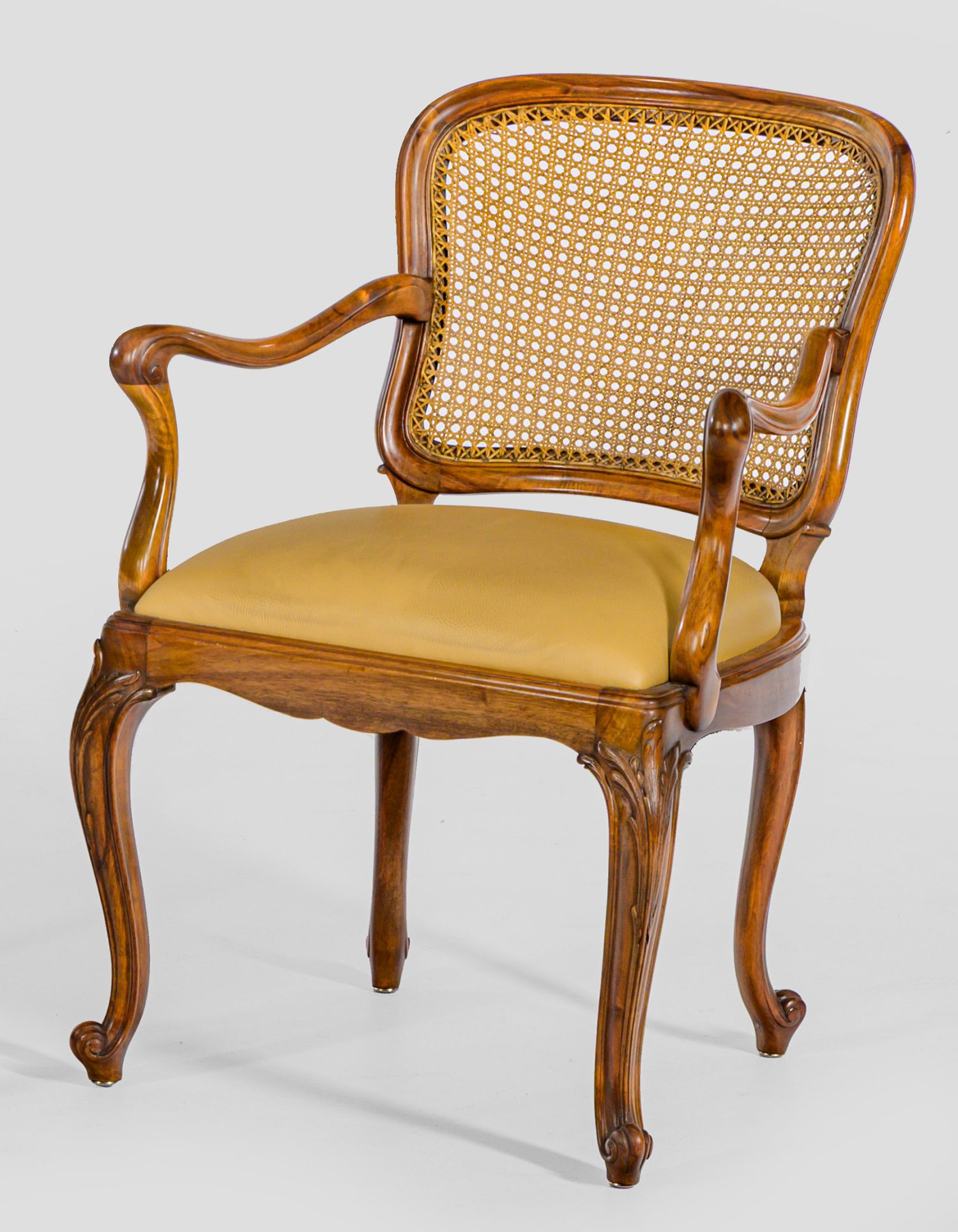 Nussbaum. Passig geschweifte Zarge auf blattreliefierten, geschwungenen Beinen. Korrespondierende, geschwungene Armlehnen sowie gewölbte Rückenlehnenrahmung mit Rohrgeflecht. Sitzfläche gepolstert und bezogen. Sitz-H. 49 cm.