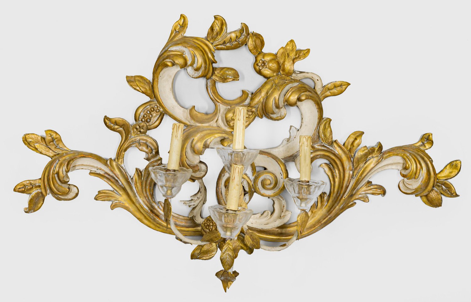 4-flg.; Holz, geschnitzt, cremefarben gefasst und teilw. vergoldet. Metall und Glas. Durchbrochen gearbeitetes Wandschild aus üppigen, asymmetrisch angelegten, eingerollten Blattvoluten. Davon ausgehend stark geschwungene Leuchterarme als Träger für Leuchtmittel. Elektrifiziert. H. 60 cm. 106 cm x 37 cm.