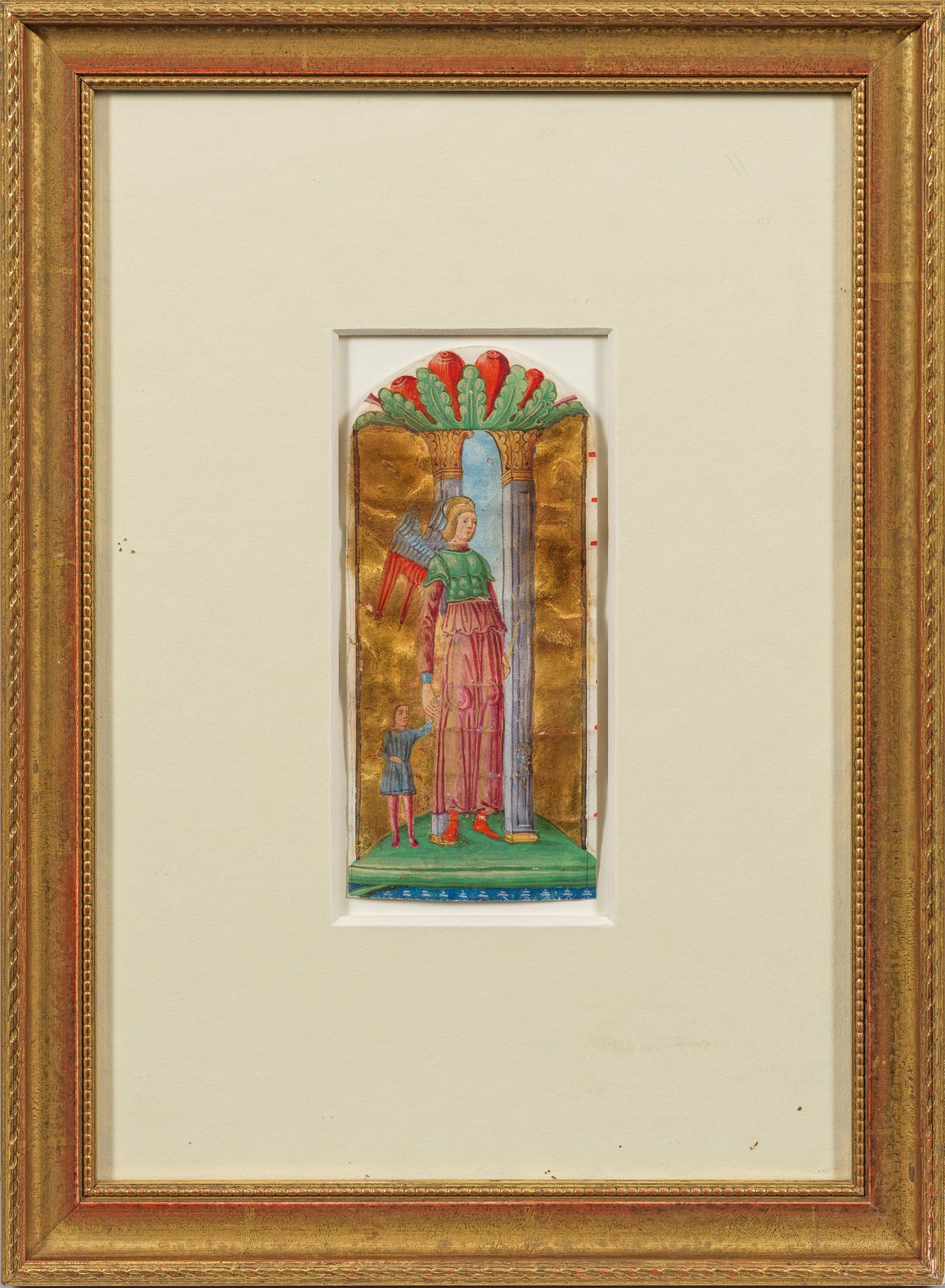 In leuchtendem Kolorit, auf Goldgrund gezeichnete Darstellung des Erzengels Raphael, der den jungen Tobias auf Geheiß Gottes auf seiner Reise begleiten und führen soll. Fein gemalte Buchillustration als Bildinitiale „I“, vermutlich aus einem Antiphonarblatt. Gouache und Goldpigment über Bleistift/Papier. 17,4 cm x 8 cm. Rahmen.