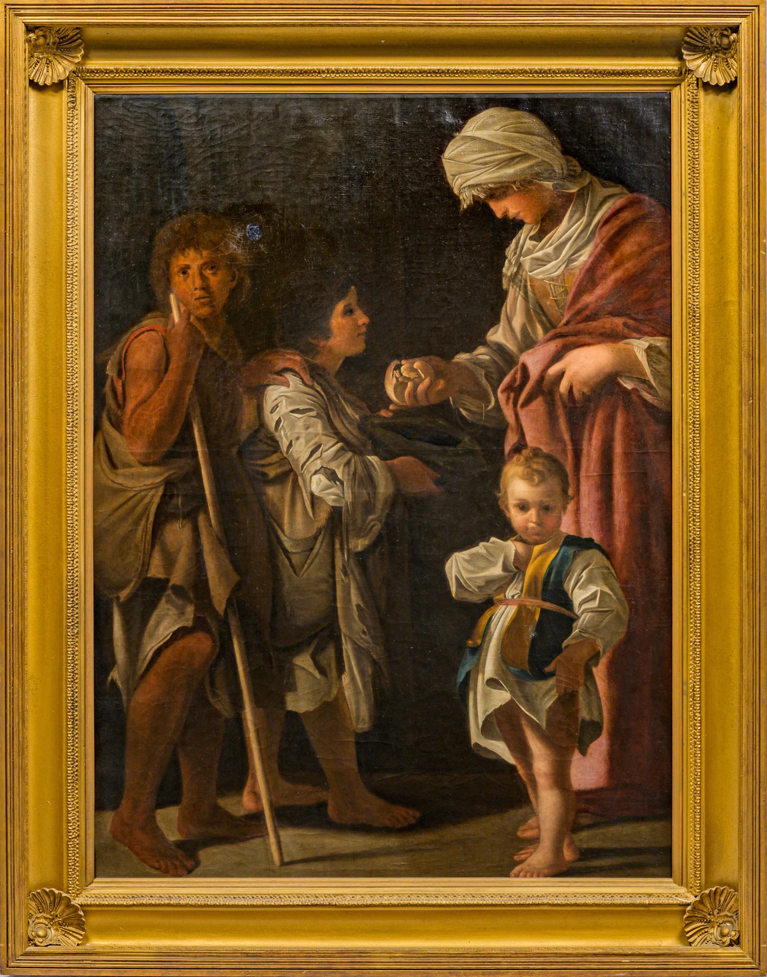 Personifikation der Kardinaltugend Caritas, Liebe, hier im Sinne der Nächstenliebe, welche an bedürftige Kinder Gaben austeilt. Die Kopie aus dem ausgehenden 18. oder 19. Jh. ist kleiner als das Original (180 cm x 128 cm), das sich im Museum von Capodimonte befindet und zu den bis ins 19. Jh. immer wieder kopierten Werken der Barockmalerei gehört. Öl/Lwd.; Verso alter Klebezettel bez. "Charity by Scidonie". 124 cm x 92 cm. Rahmen.