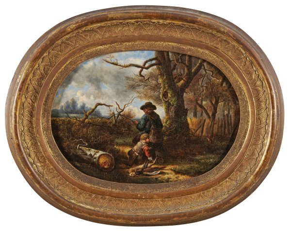 Vom Waldesrand beobachtet der Vater mit Flinte das Kornfeld, während sein Sohn einen Hasen im Wald entdeckt hat. Öl/Holz. 29 cm x 43 cm. Ovaler Rahmen.