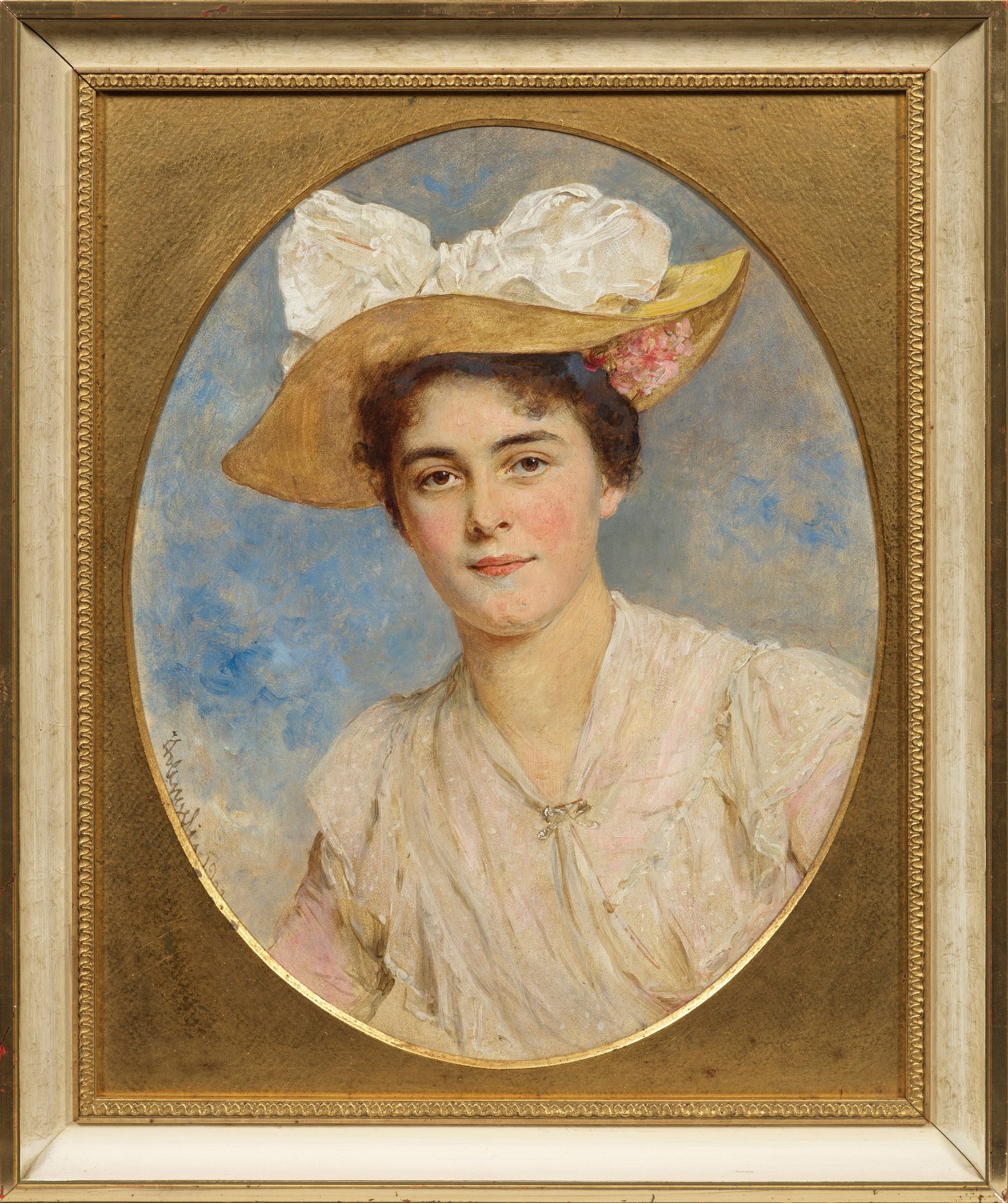 In duftig-lockerem Duktus und freundlichen hellen Farben gemaltes Porträt des Jugendstils. Von Angeli avancierte wegen seiner realistischen Darstellungsweise in Verbindung mit psychologischer Einfühlung seit den 1860er Jahren zu einem der angesehensten und bedeutendsten Bildnismaler seiner Zeit und erhielt Aufträge bis hinein in österreichische, deutsche und englische Adels- und Fürstenhäuser. Öl/Holz. R. sign. u. dat. 1902. Sichtbarer Bildausschnitt im Ovalpassepartout 36,5 cm x 28 cm. Rahmen.