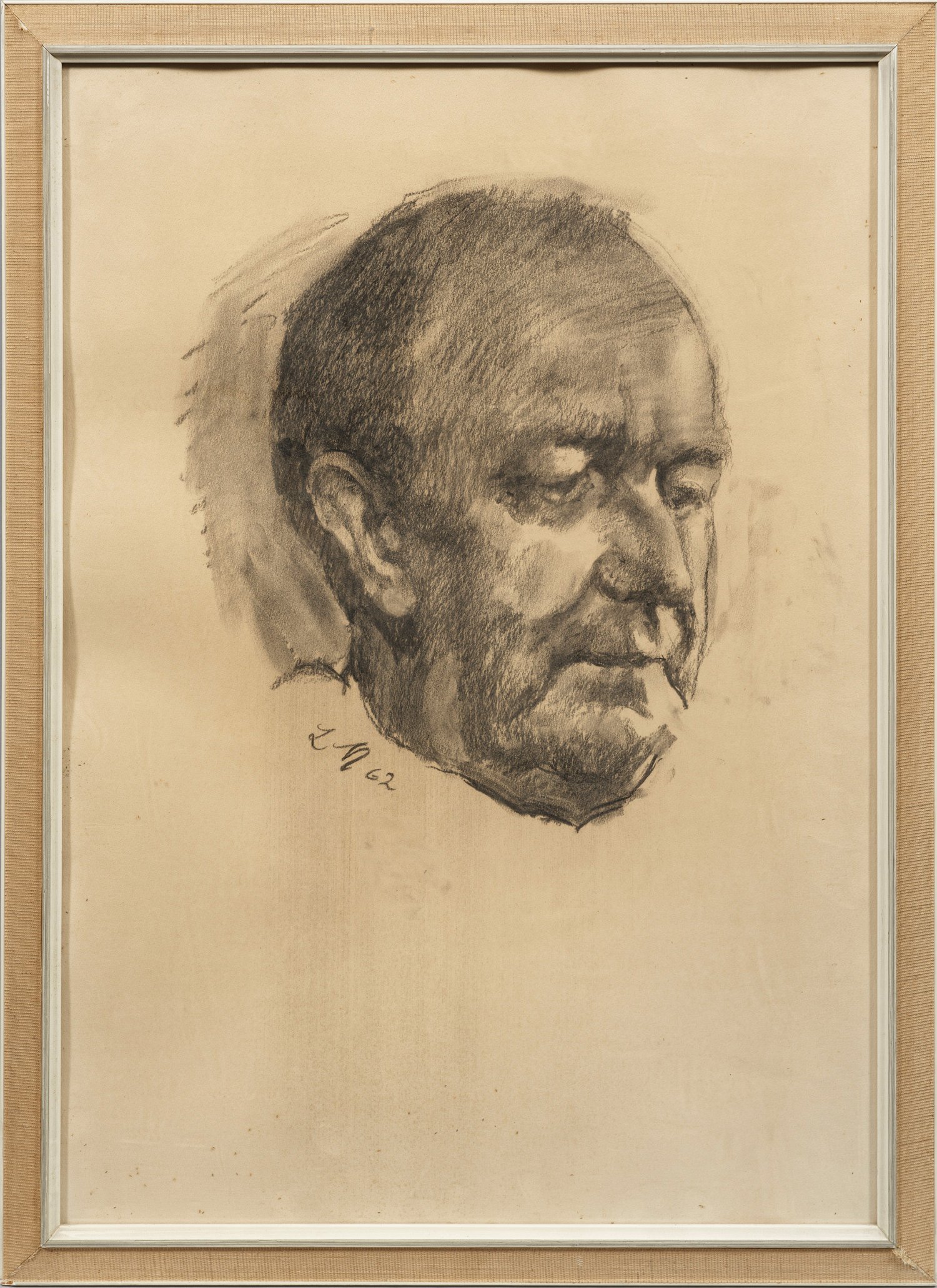 Mit kraftvollen Strichen und dunklen Schraffuren ausgeführte Studie eines Mannes im mittleren Alter, der seinen Blick gesenkt hat. Kohle/Papier. L. u. monogr. und dat. (19)62. Darstellung ca. 33,5 cm x 28,5 cm. Rahmen.
